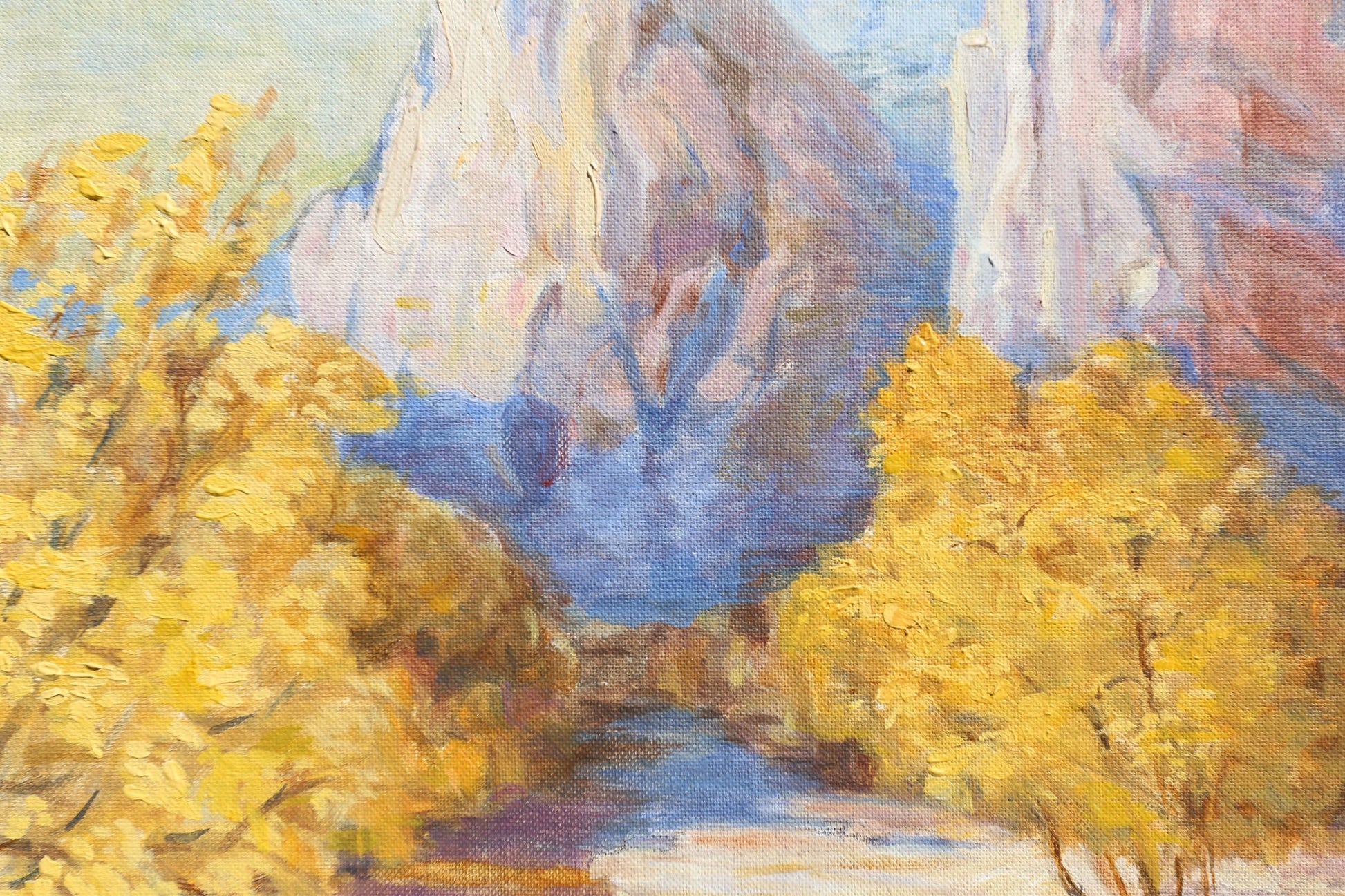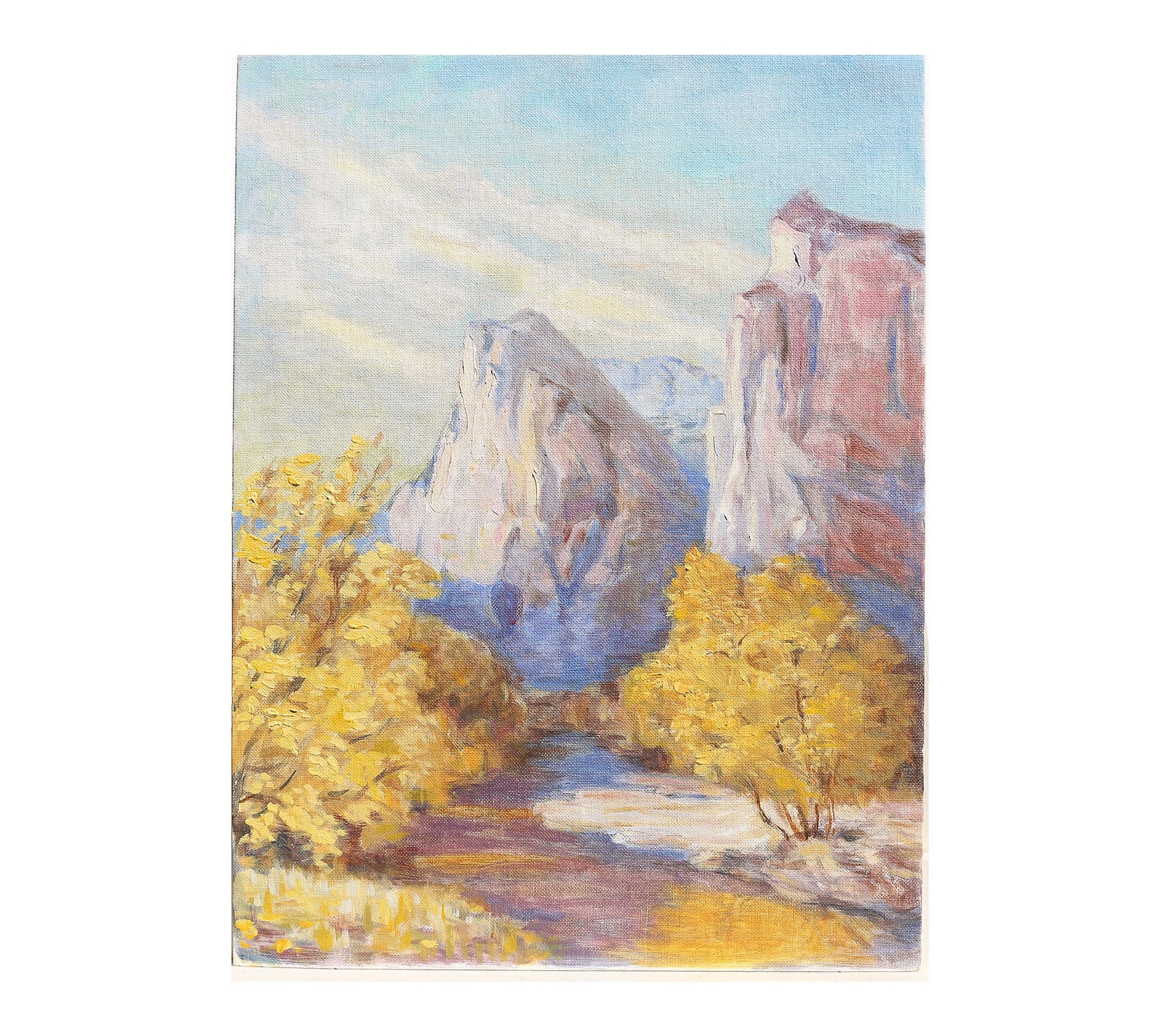 Oil Painting Landscape Treescape on Canvasboard "Connecticut Rock Formations with Autumn Fall Trees" Artist Jule Melbardis 1950s