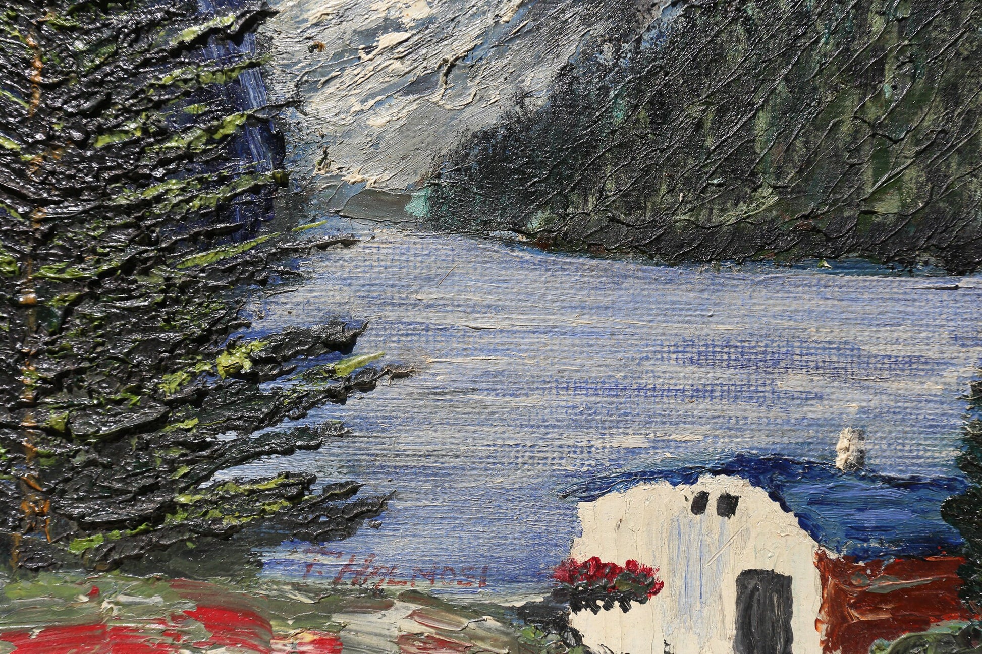 Oil Painting Mountain Lake Cottage Scene Artist Signed T. Halnosi on Board