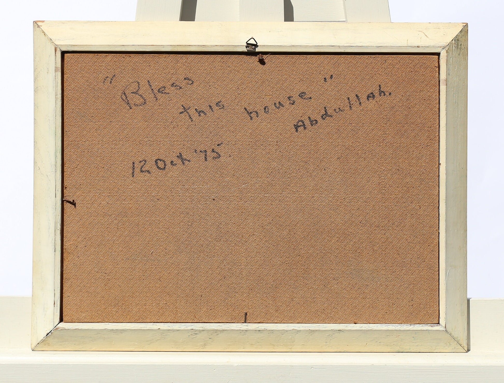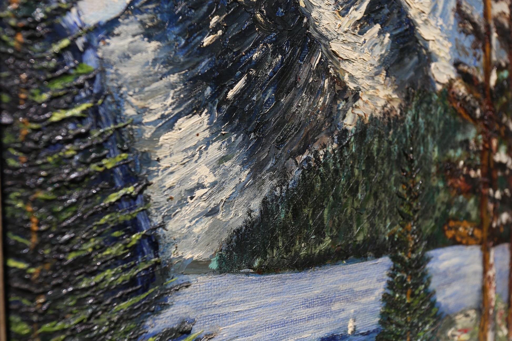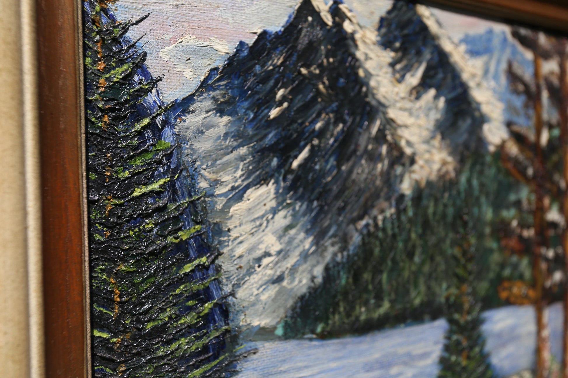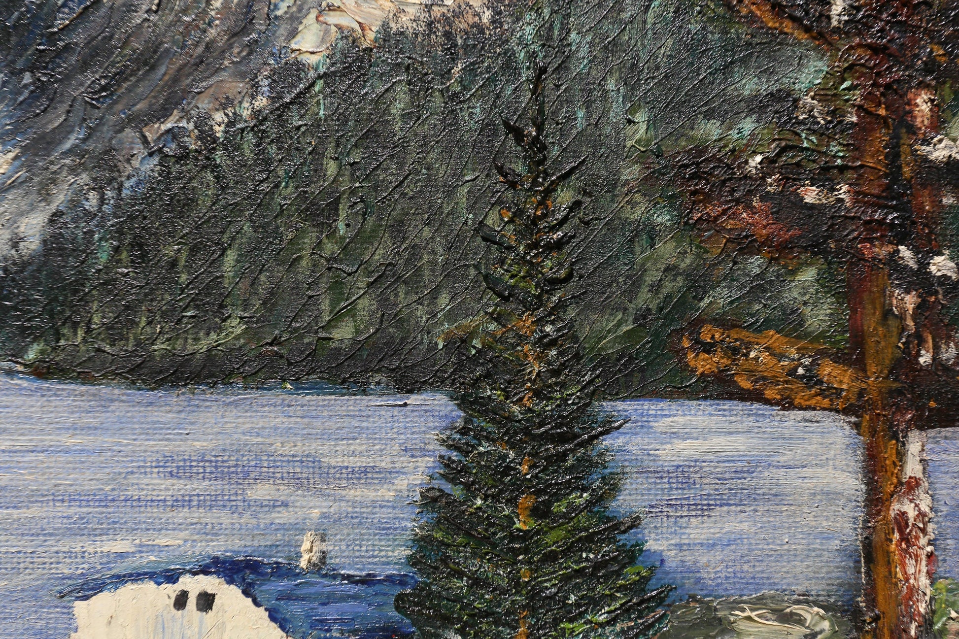 On offer artist signed T. Halnosi heavy oil on board depicting mountain lake scene and cottage, likely the Canadian Rockies. Almost impasto application of paint with both brush and palette knife throughout. Packs a big punch for such a small painting. Interestingly, this painting covers another earlier work titled "Bless this house," by Abdullah.