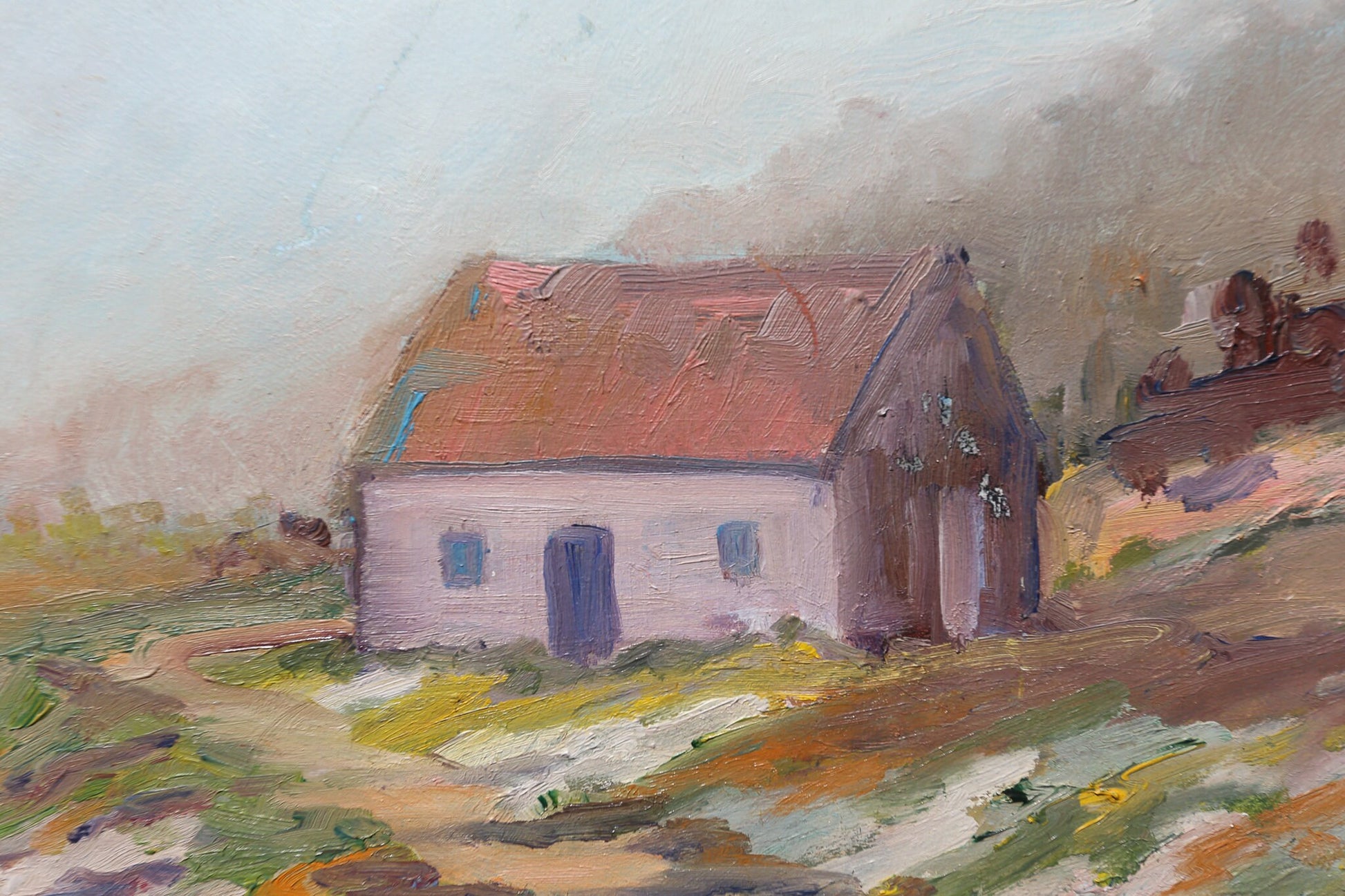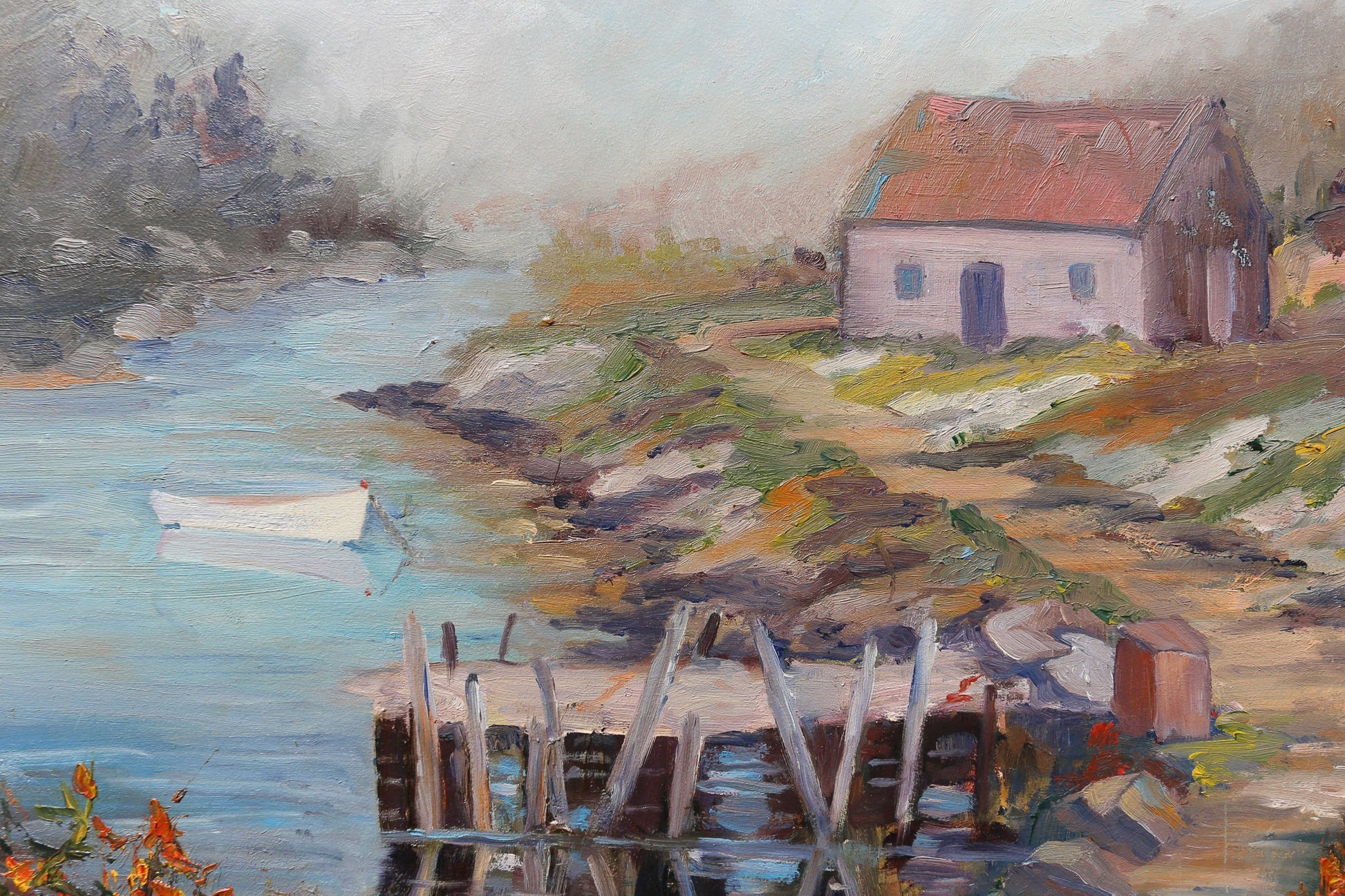 Oil Painting Signed American Impressionist River Harbor Cottage and Dory Rowboat 1970s Period Frame on Board