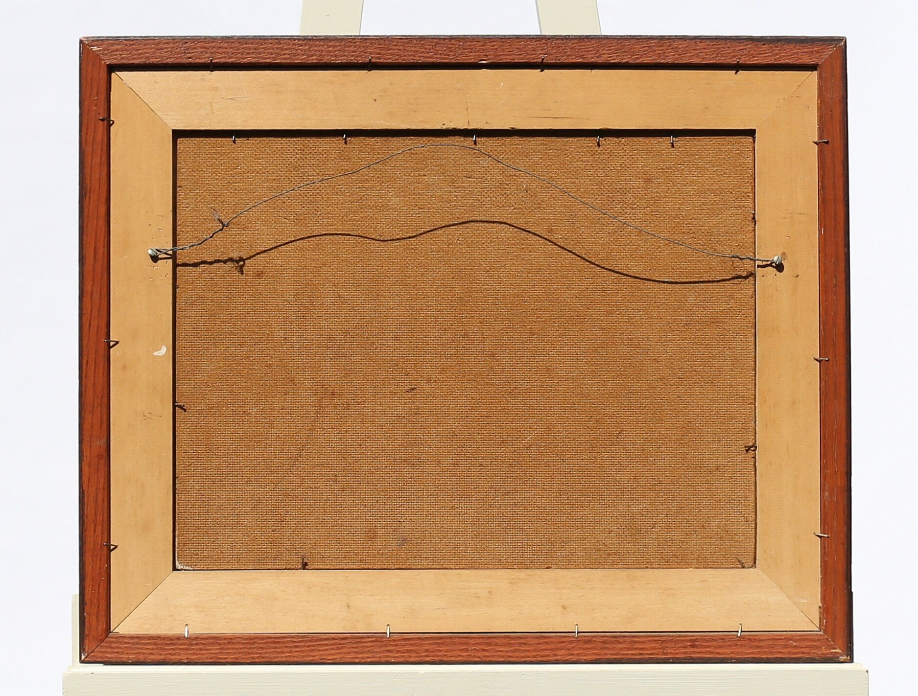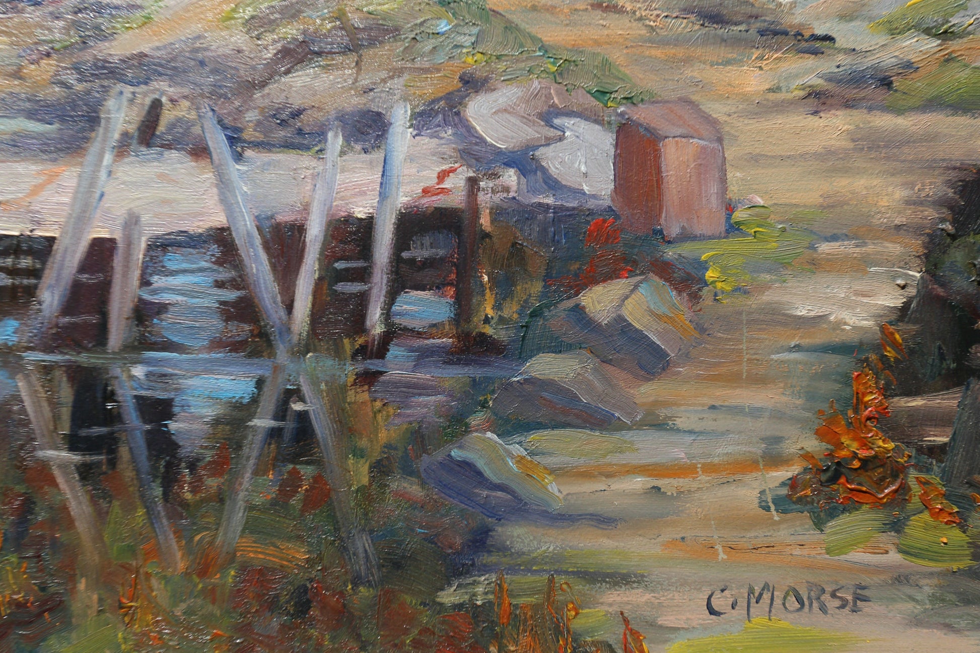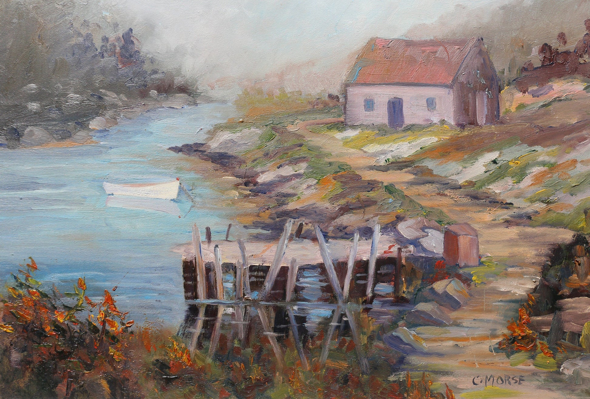 On offer artist signed C. Morse oil on board depicting a protected harbor with dory on mooring. Soft pastel colors dominate in this calming mid century impressionist scene.