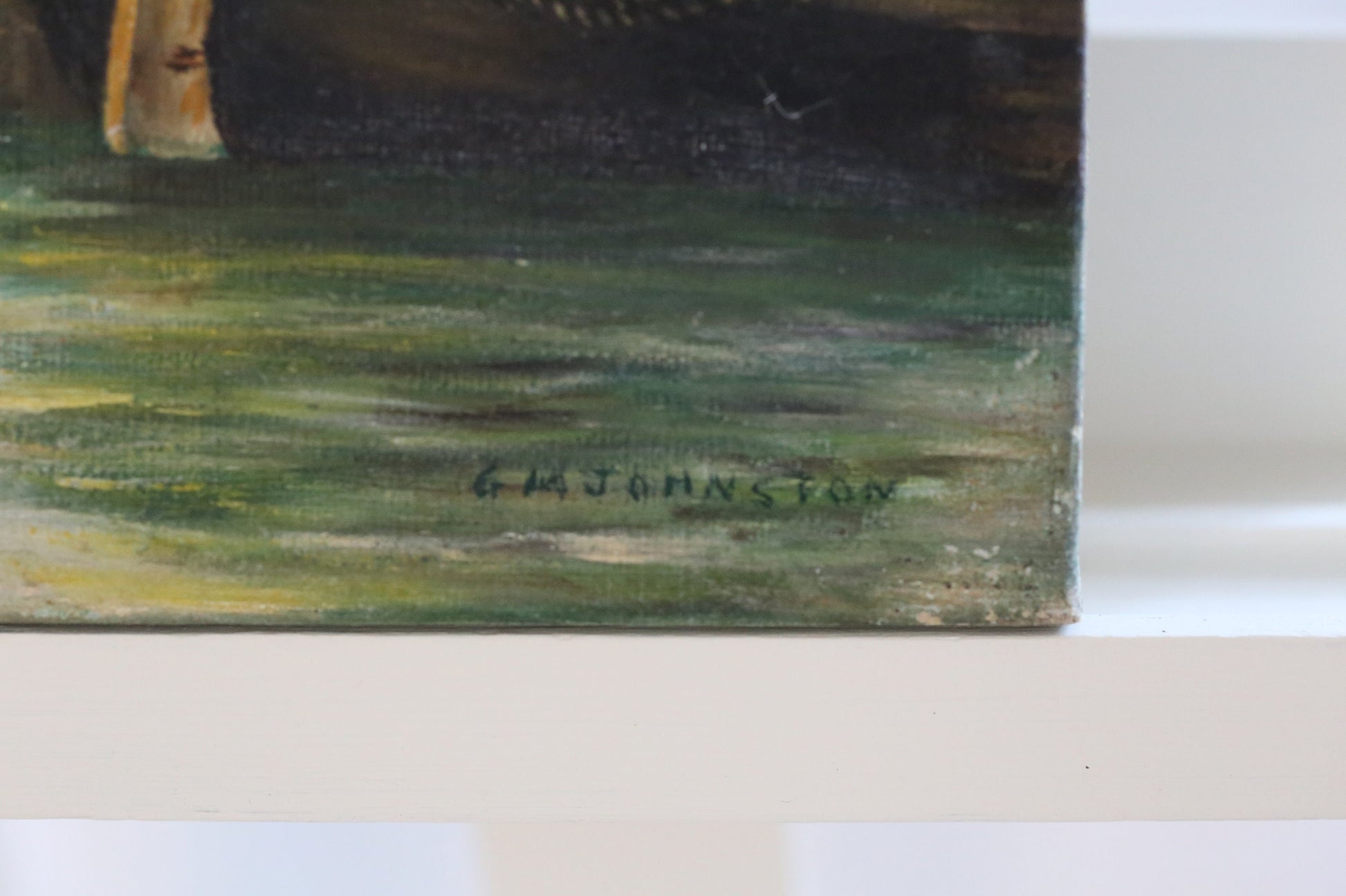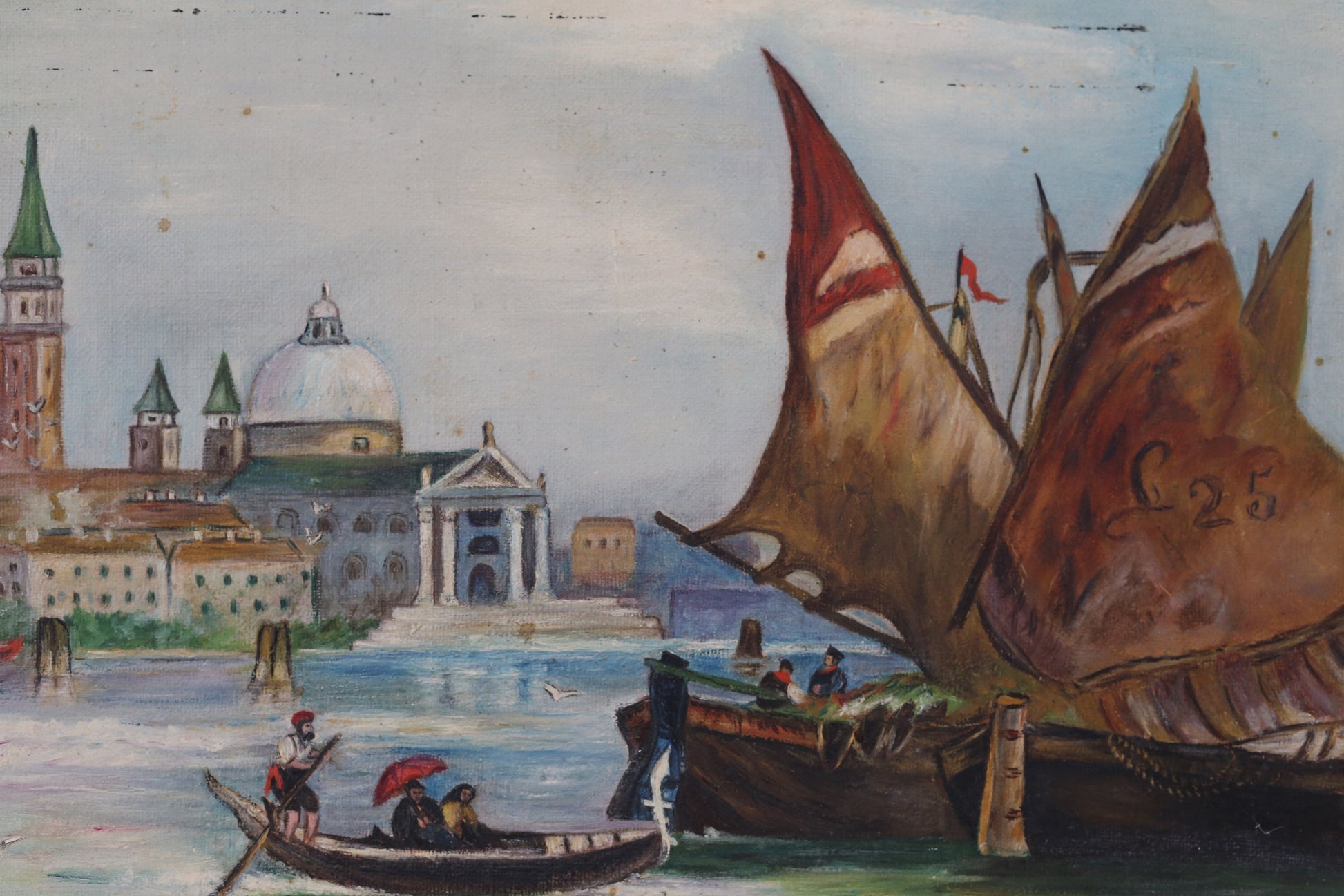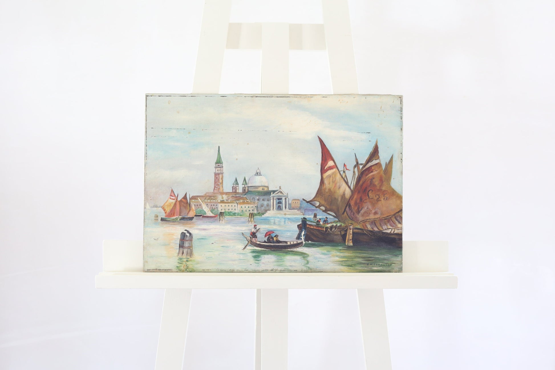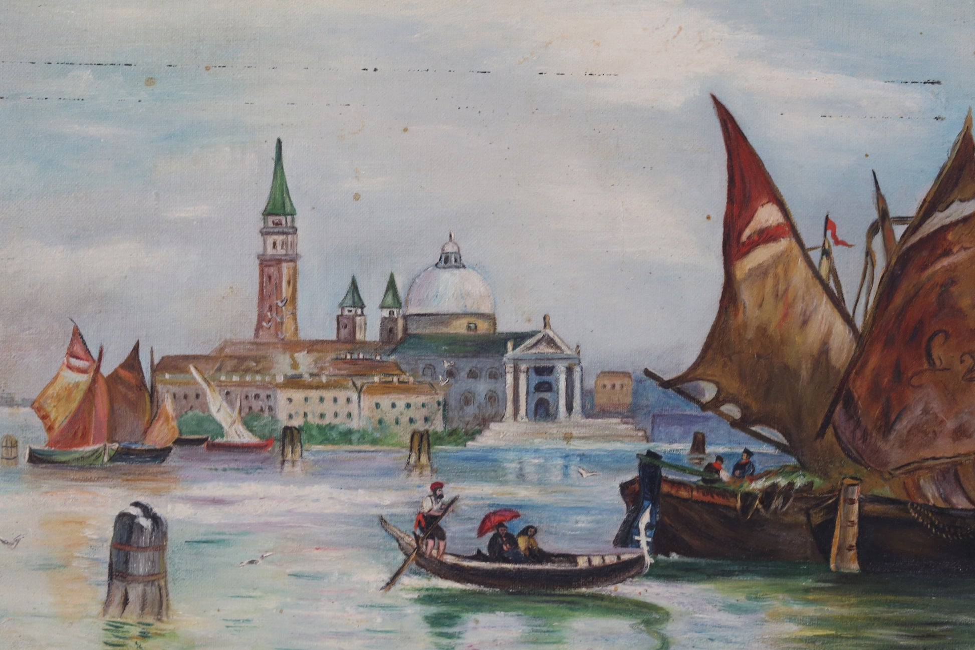Painting on Canvas Venice Oil on Canvas ca 1900-1910 Signed GM Johnston Original Harbor Nautical Italy Antique Grand Canal Gondolas