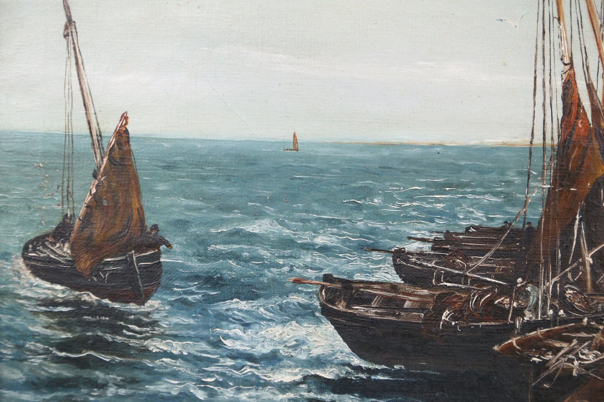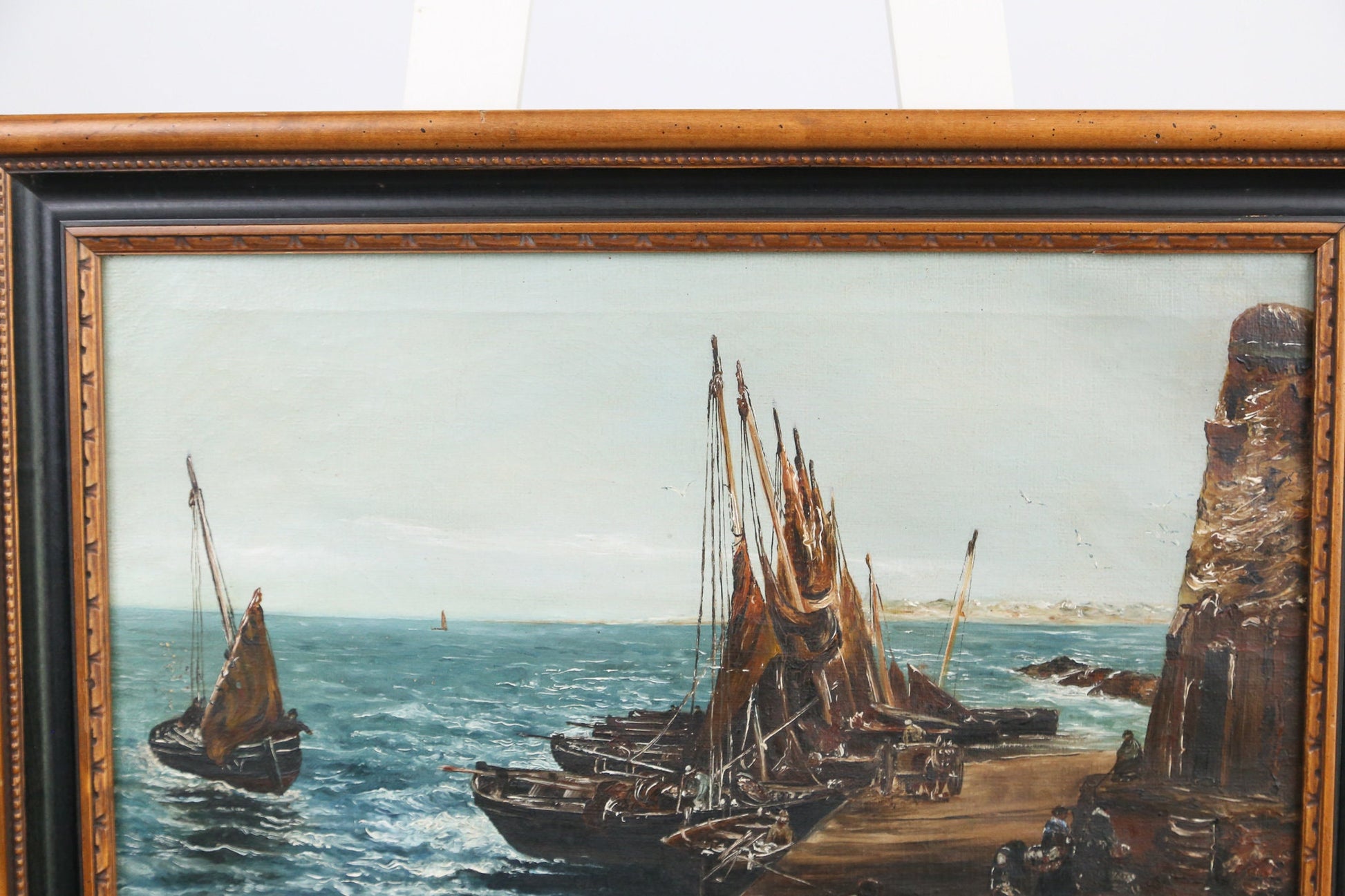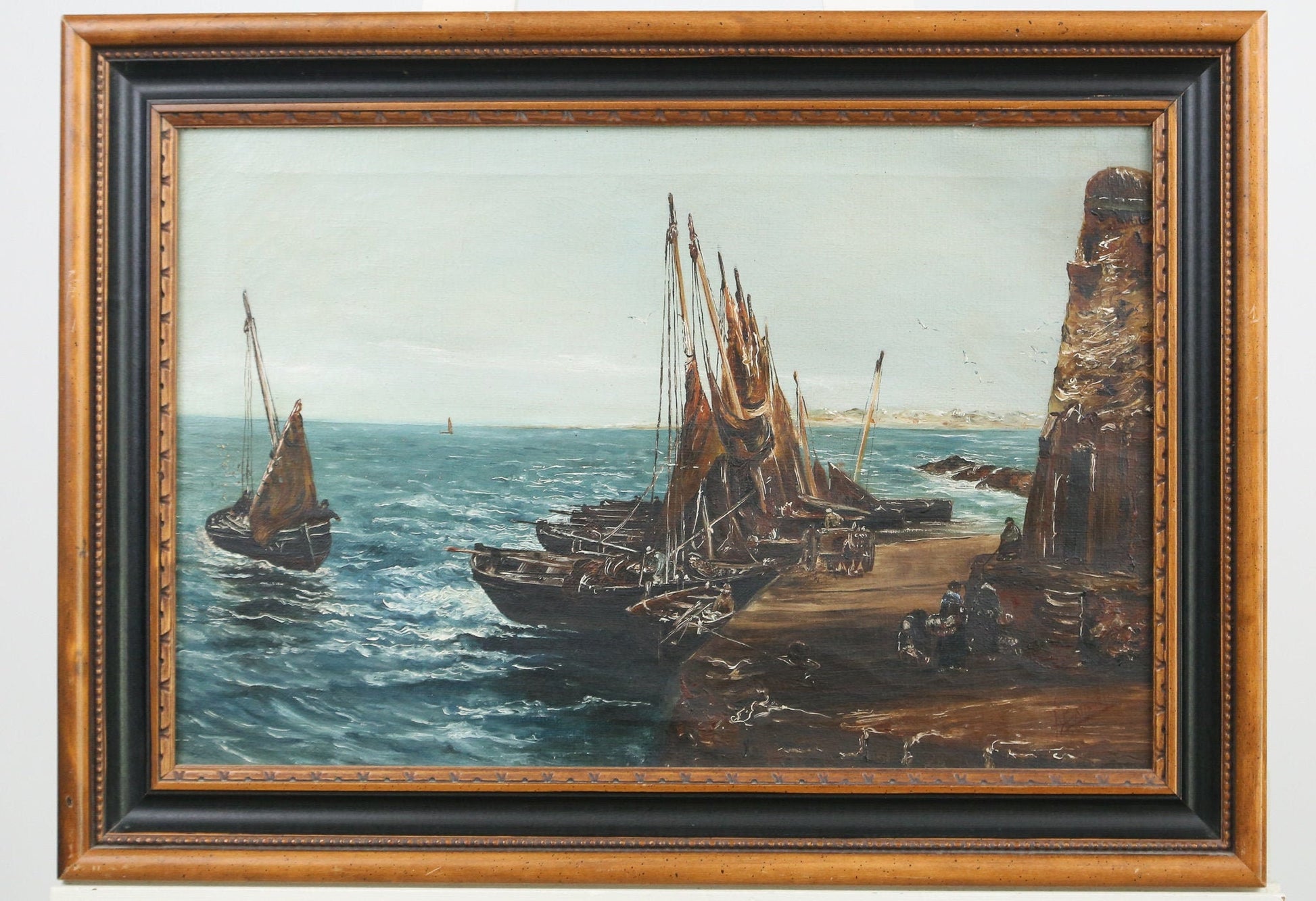 Painting Seascape Oil on Canvas Harbor Boats Signed A Bain 1911 Framed