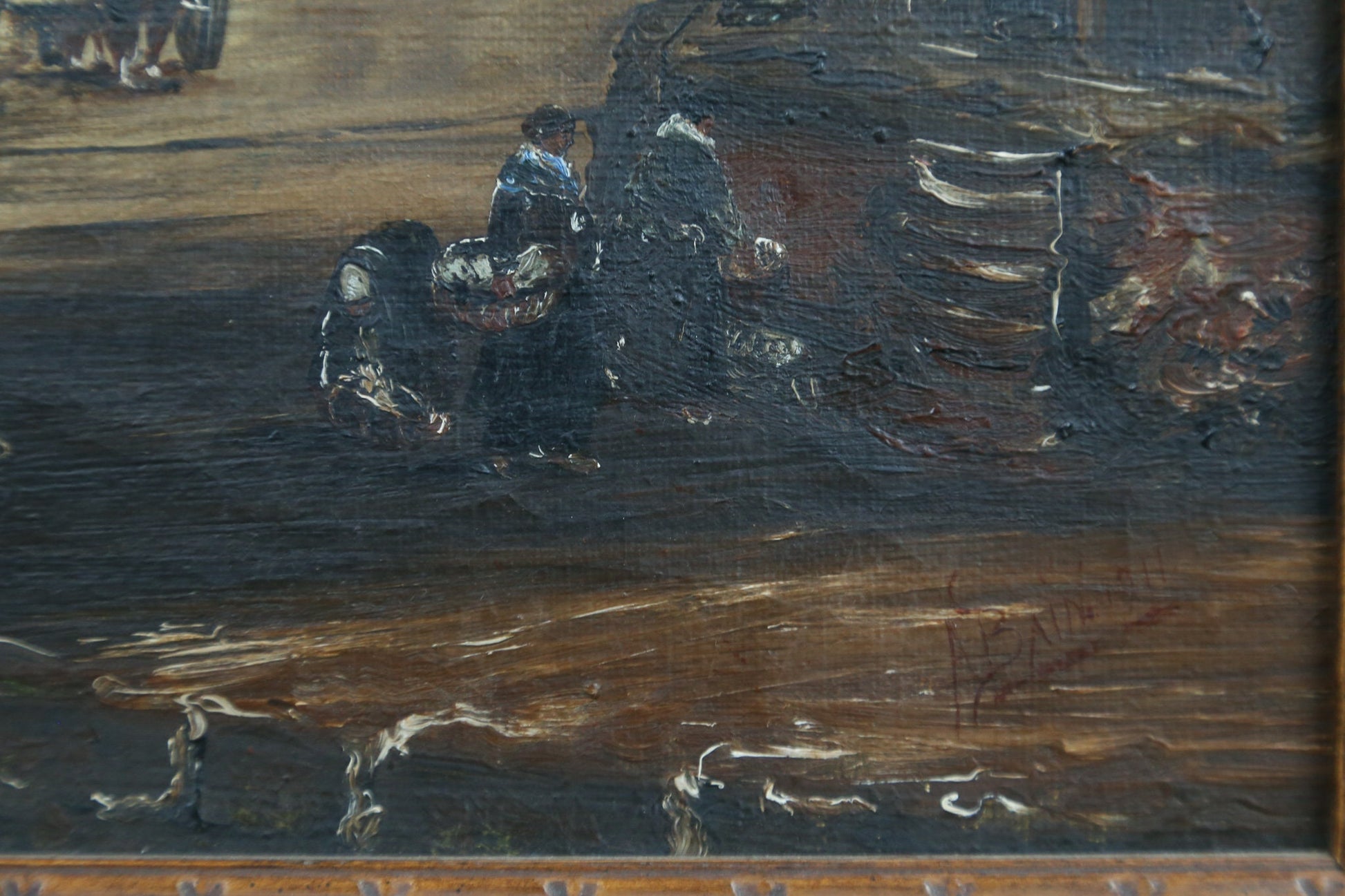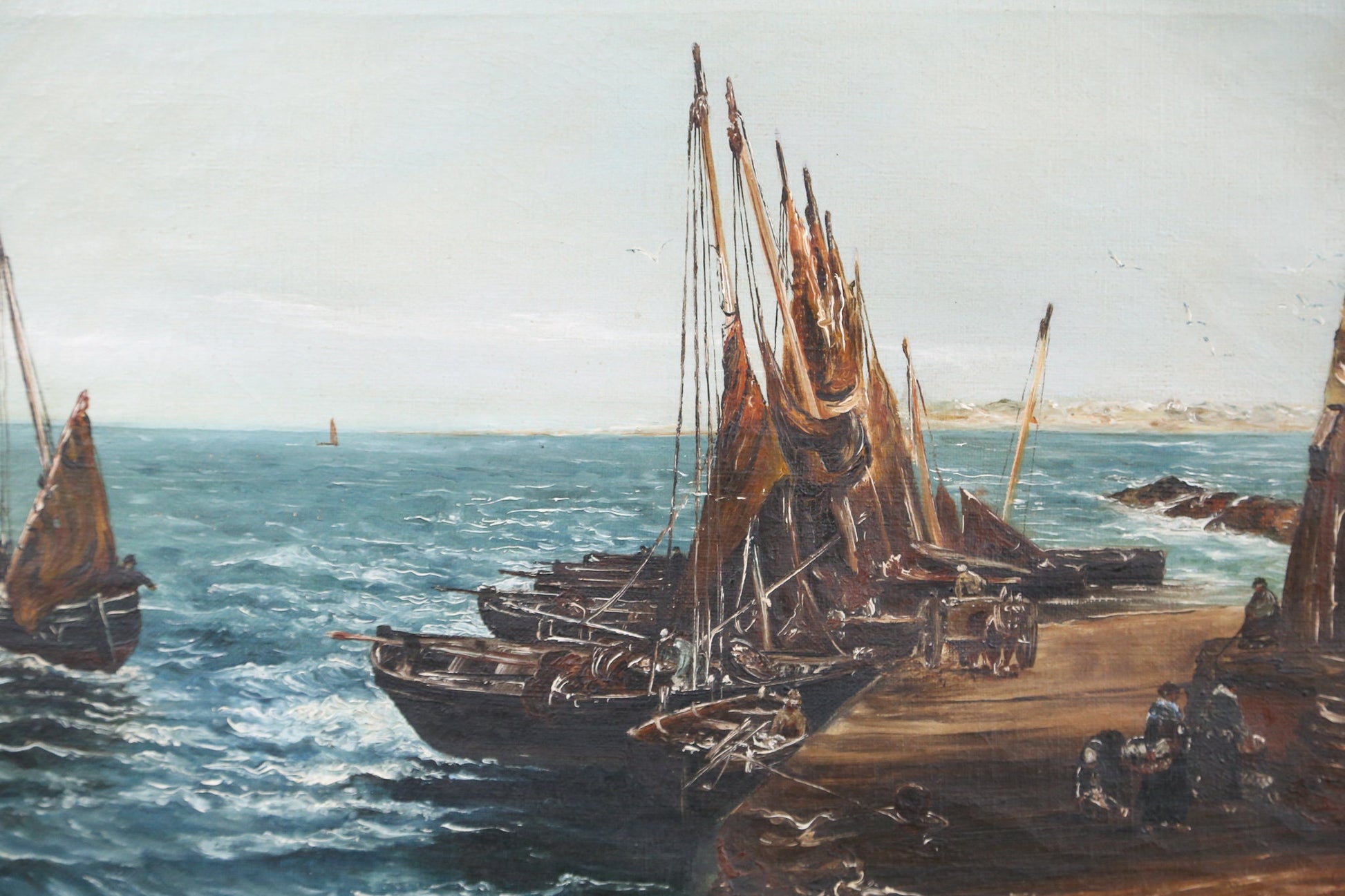 On offer moody seascape harbor scene oil on canvas depicting Mediterranean fishing ships tethered to a dock and figures engaged in seafaring trade. Wonderful minimal use of color, with blue and brown dominating. Artist signed lower right A. Bain and dated 1911. Handsomely framed in California, though this painting is most likely of an area in southern France. Exceptional representation of moving water and depth.