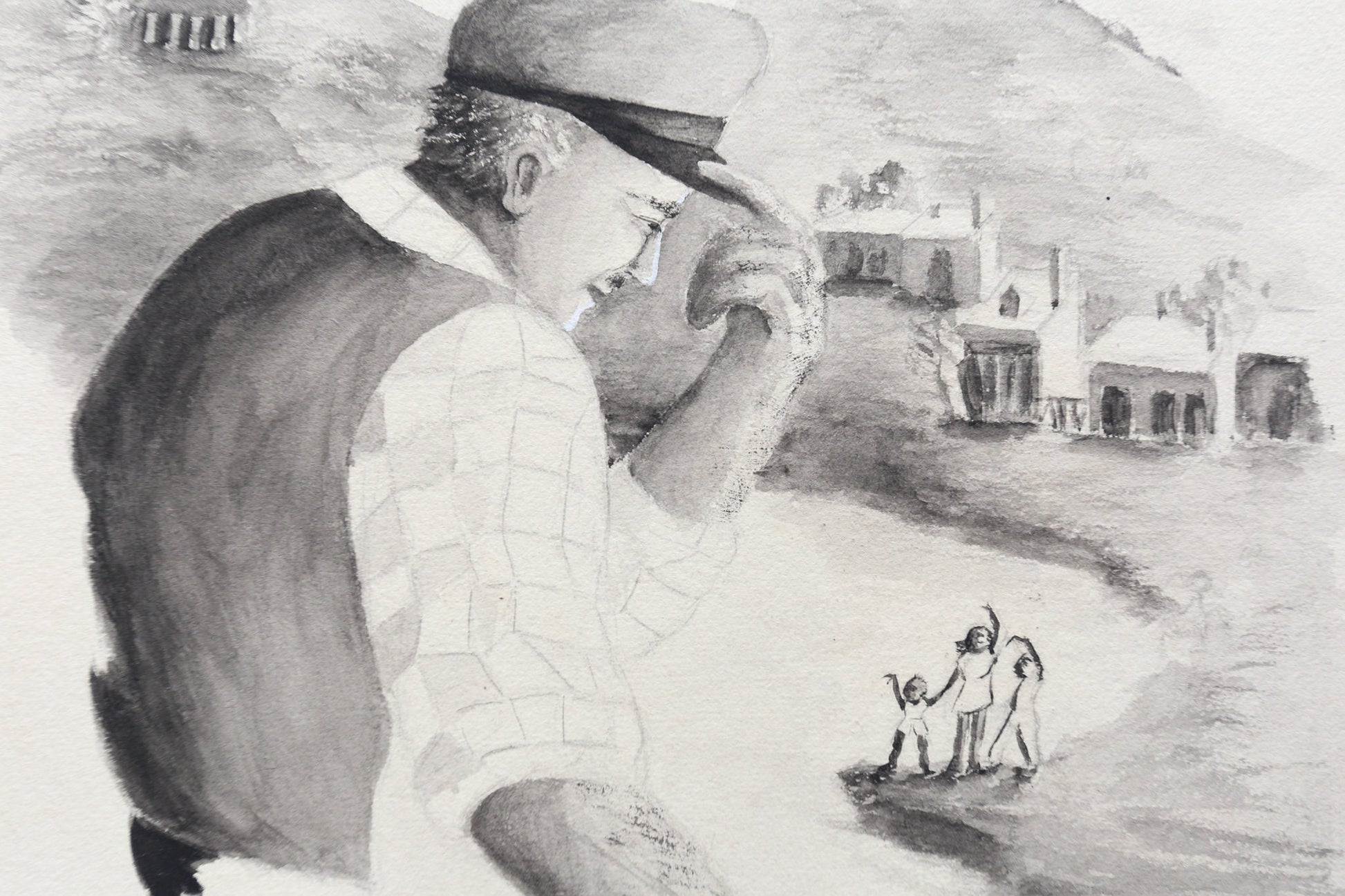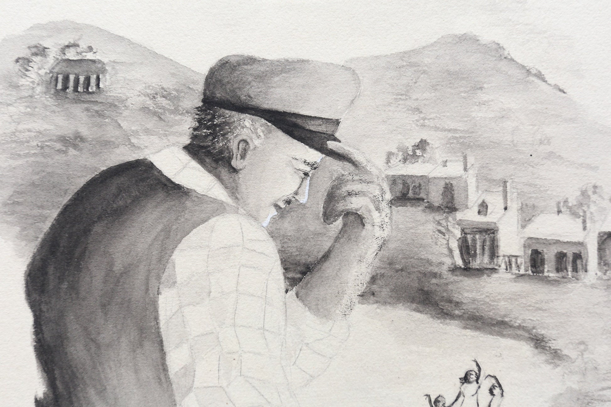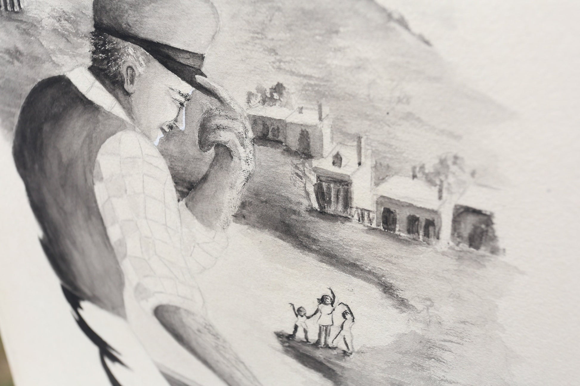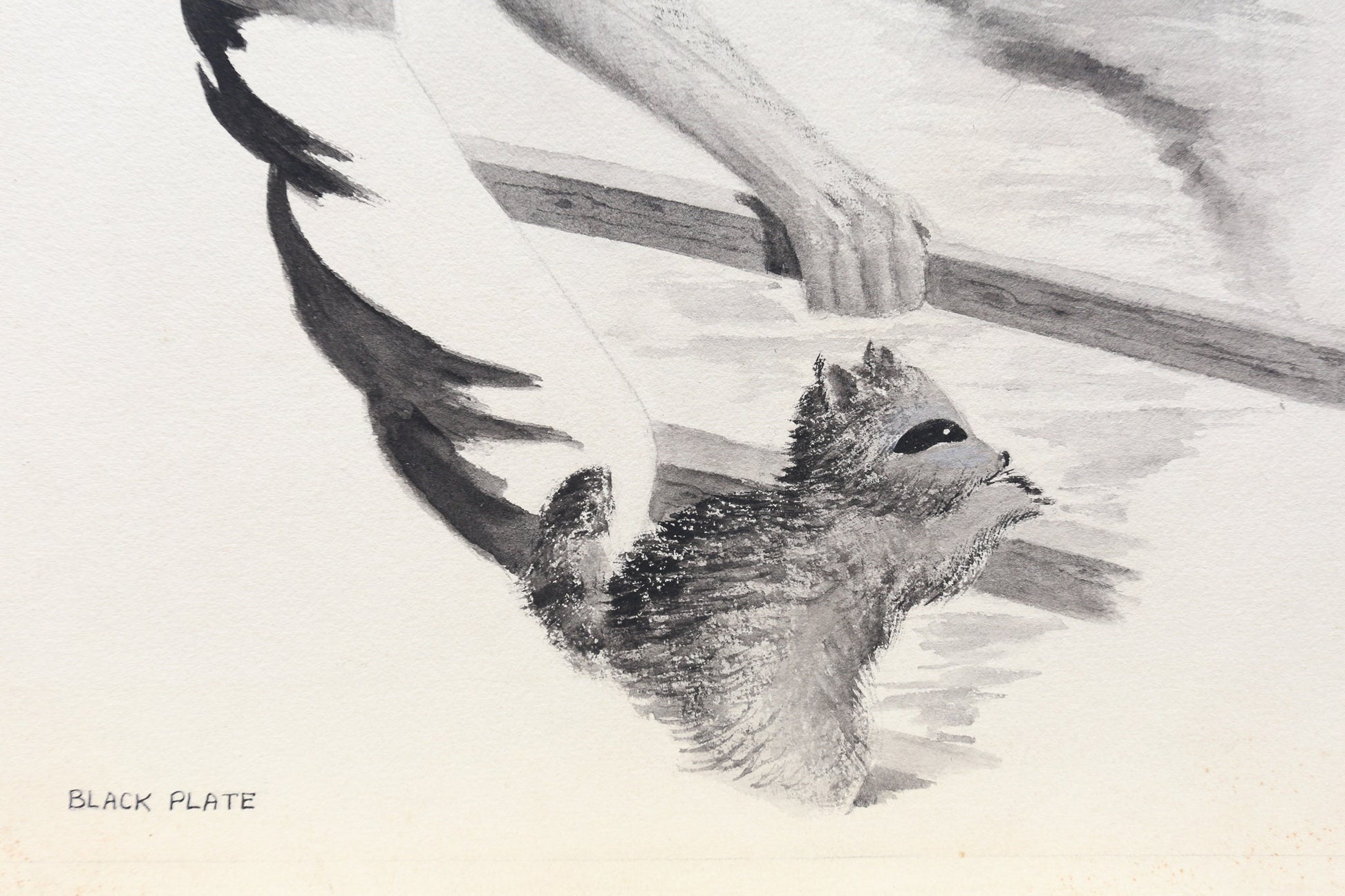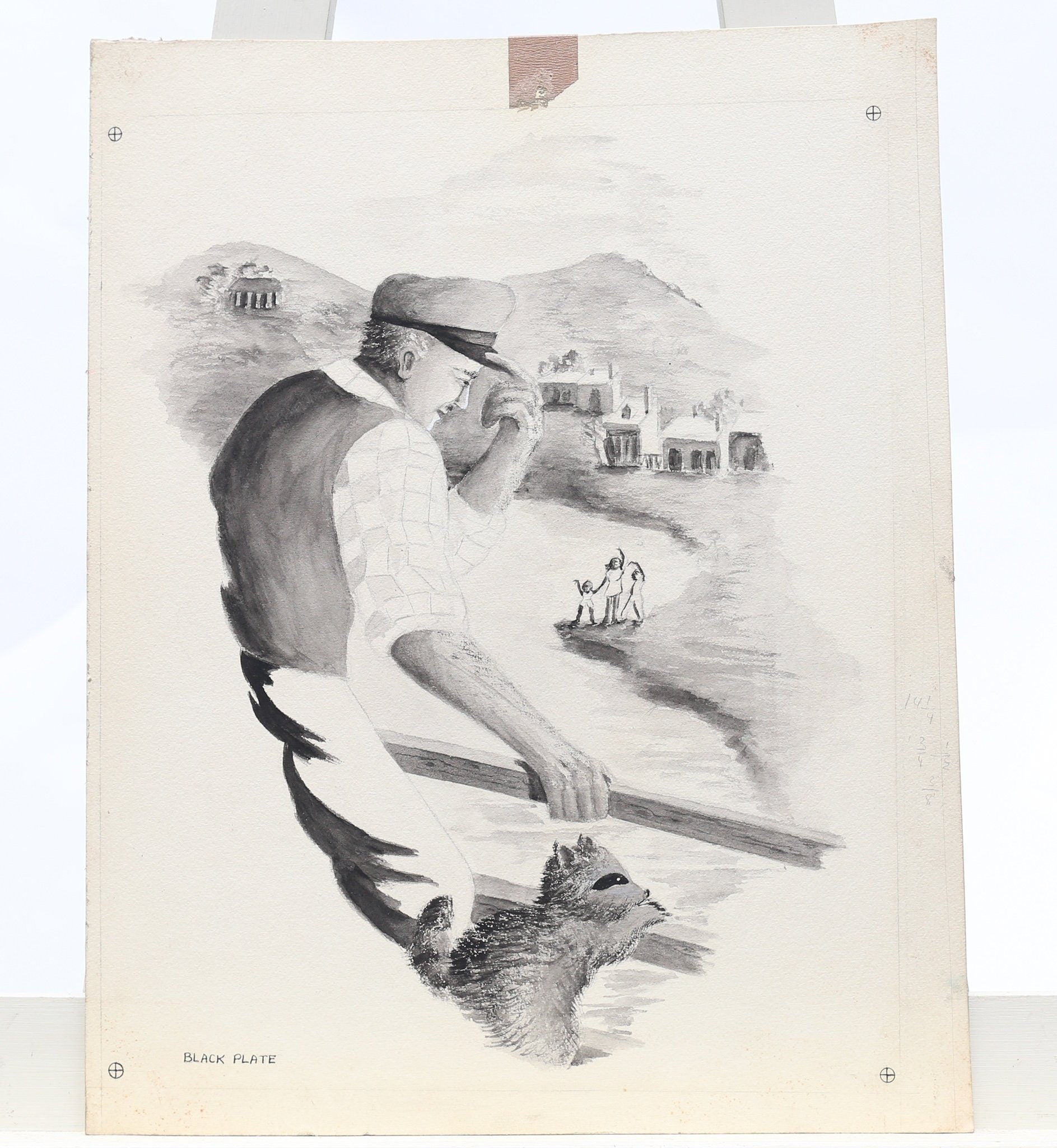 On offer watercolor gouache illustration on board depicting a milk man with his raccoon companion waving from a bridge at a family on a distant river bank, with mountain village in distance. Black and white throughout. Clothing in 1930/40s style. This is one of many original pieces of illustration art by artist Louise Rosen check my other listings. If interested in all or more than one piece from the collection, group pricing is available. Has registration marks from printing on corners and labeled "BLACK PLATE."