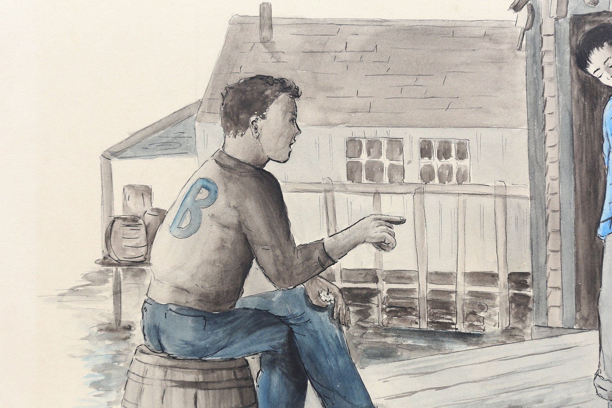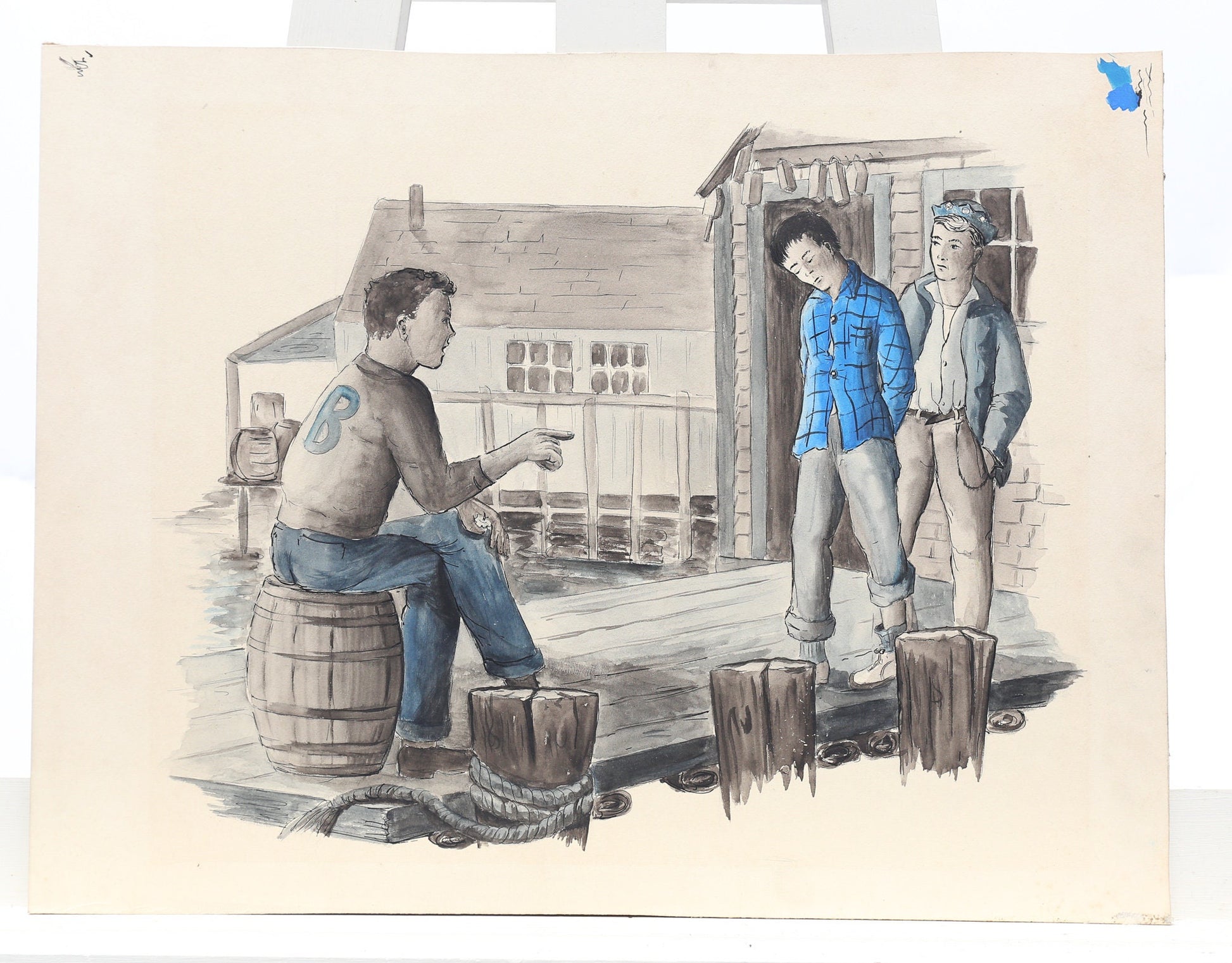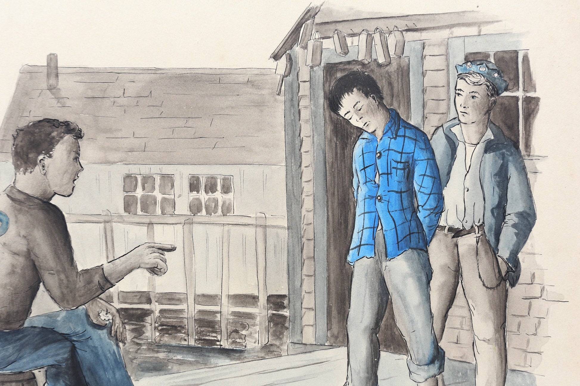 On offer watercolor gouache illustration on board depicting a group of teenage boys meting out street justice on the waterfront This illustration was clearly some sort of cautionary tale. Some gang of boys is disciplining another boy whose broken the rules: a blond boy in crown beanie holds his victim handcuffed, while the leader in a varsity sweater decides his fate. The leader holds something in is left hand, possibly an explosive. Black and white with blue throughout. Clothing in 1930/40s style. This is one of many original pieces of illustration art by artist Louise Rosen check my other listings. If interested in all or more than one piece from the collection, group pricing is available. On Arthur Brown artist board.