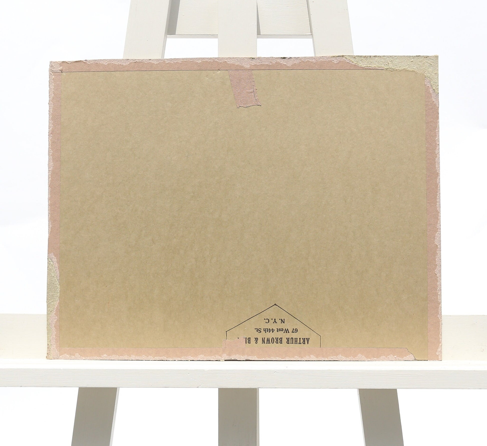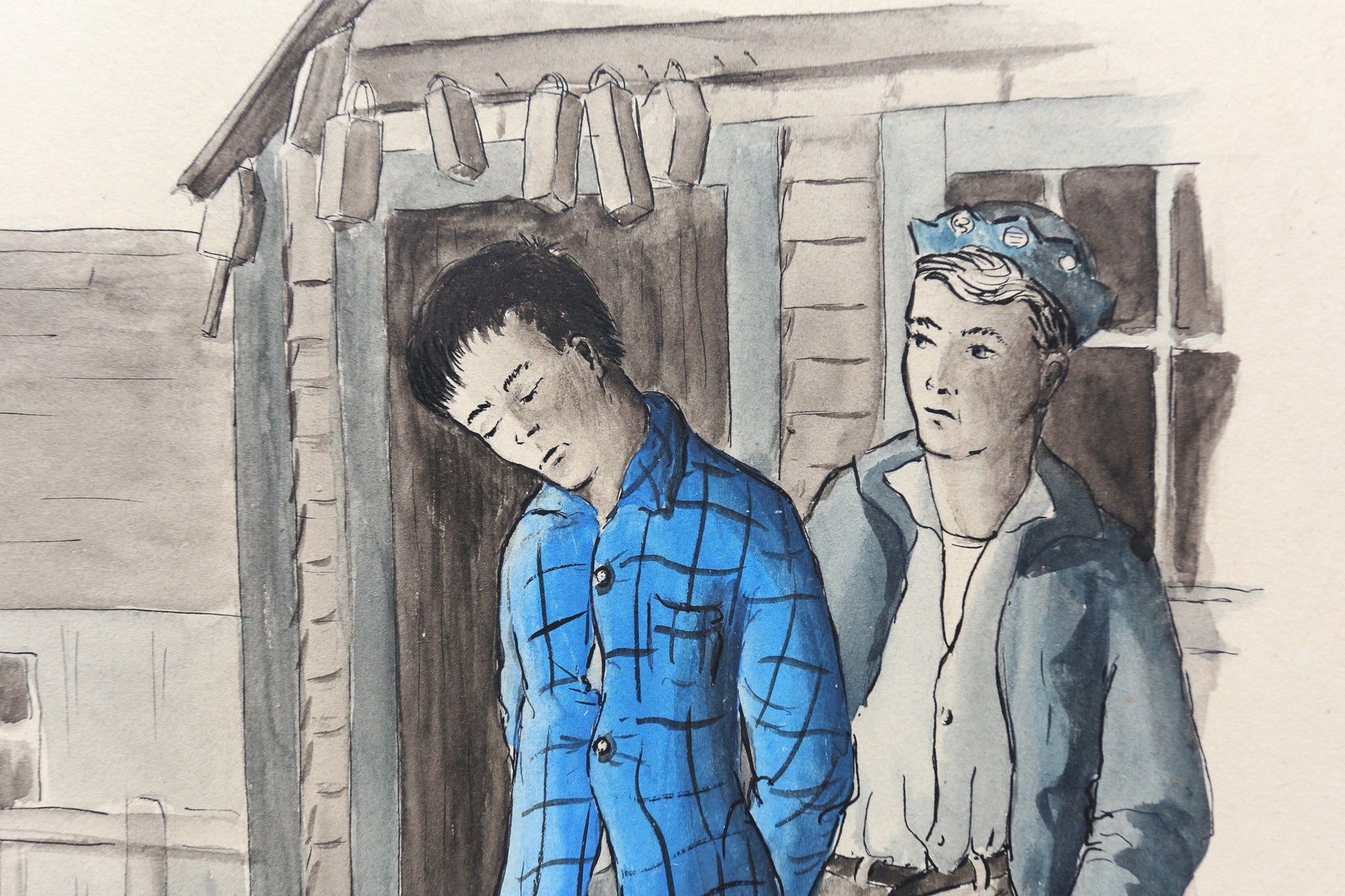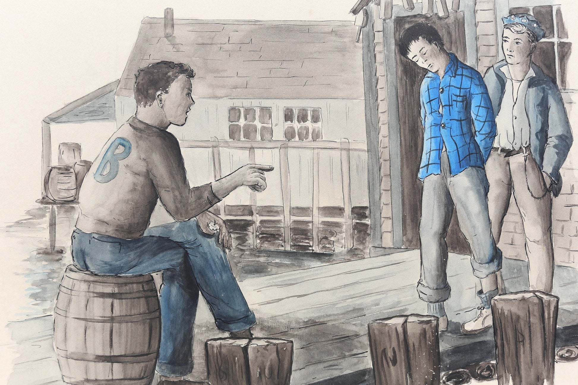On offer watercolor gouache illustration on board depicting a group of teenage boys meting out street justice on the waterfront This illustration was clearly some sort of cautionary tale. Some gang of boys is disciplining another boy whose broken the rules: a blond boy in crown beanie holds his victim handcuffed, while the leader in a varsity sweater decides his fate. The leader holds something in is left hand, possibly an explosive. Black and white with blue throughout. Clothing in 1930/40s style. This is one of many original pieces of illustration art by artist Louise Rosen check my other listings. If interested in all or more than one piece from the collection, group pricing is available. On Arthur Brown artist board.
