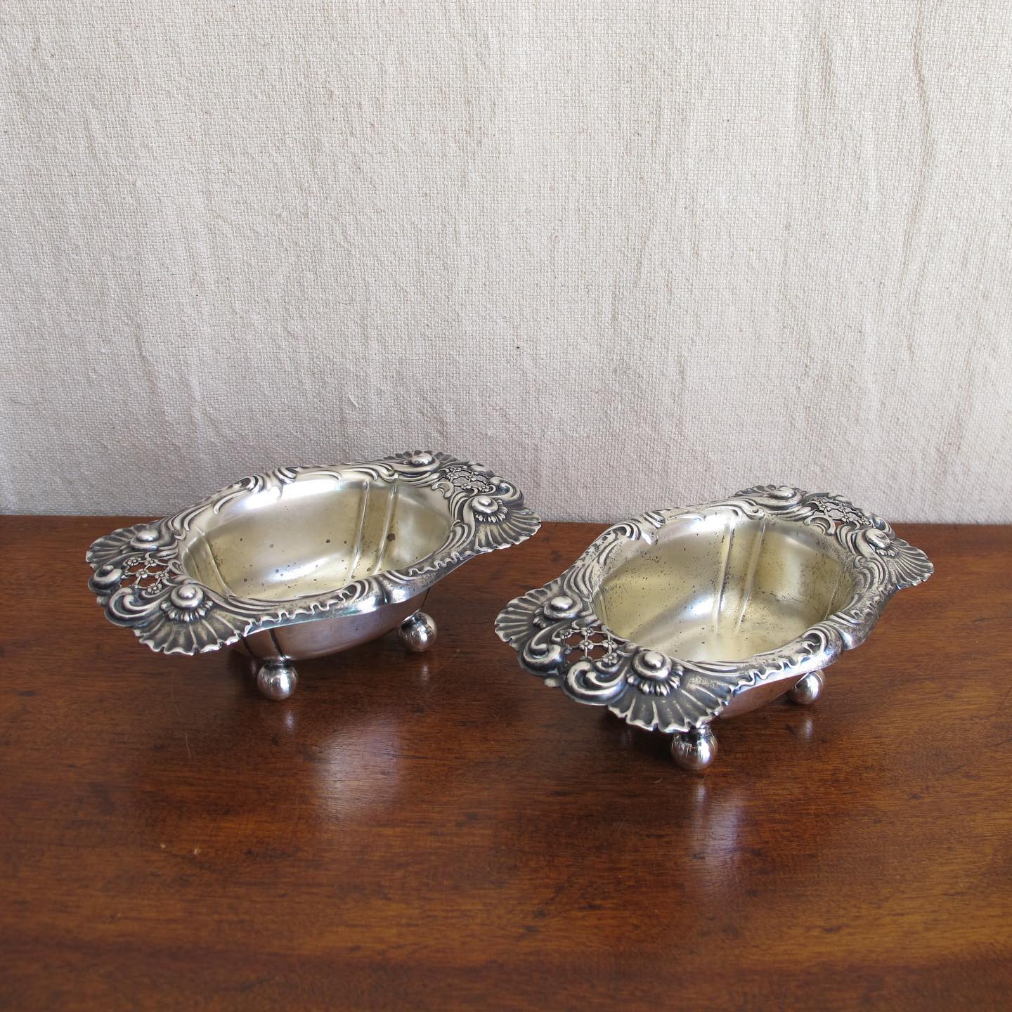Pair of reticulated sterling silver salt cellars in the “Dresden” pattern by Whiting, unusually large (elsewhere I’ve seen these described as nut dishes), with ball feet and pierced latticework, c. 1890 1900, 1.5” T x 4.5” W x 2.75” D, each weighing about 2 oz. Price is for the pair.