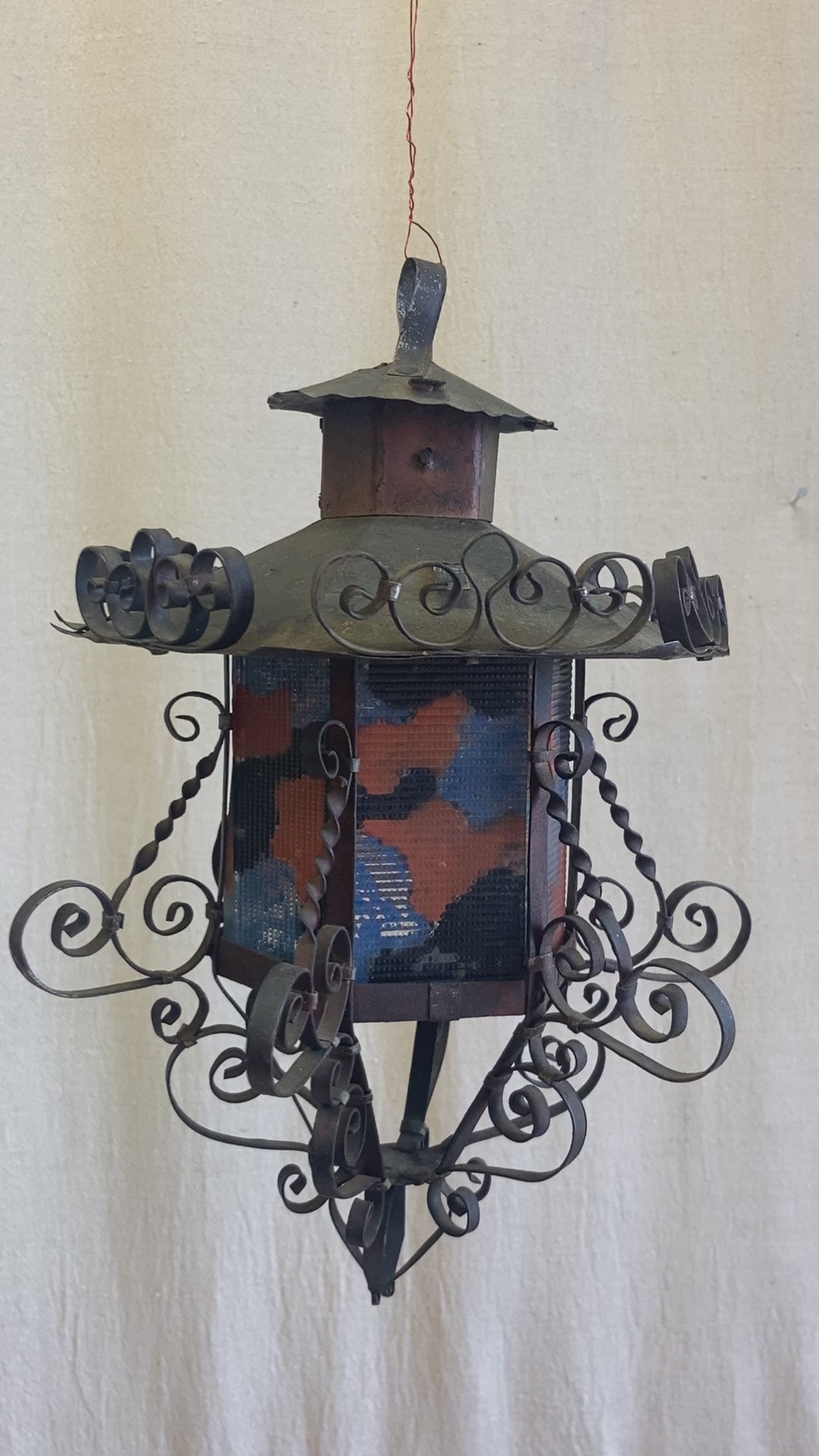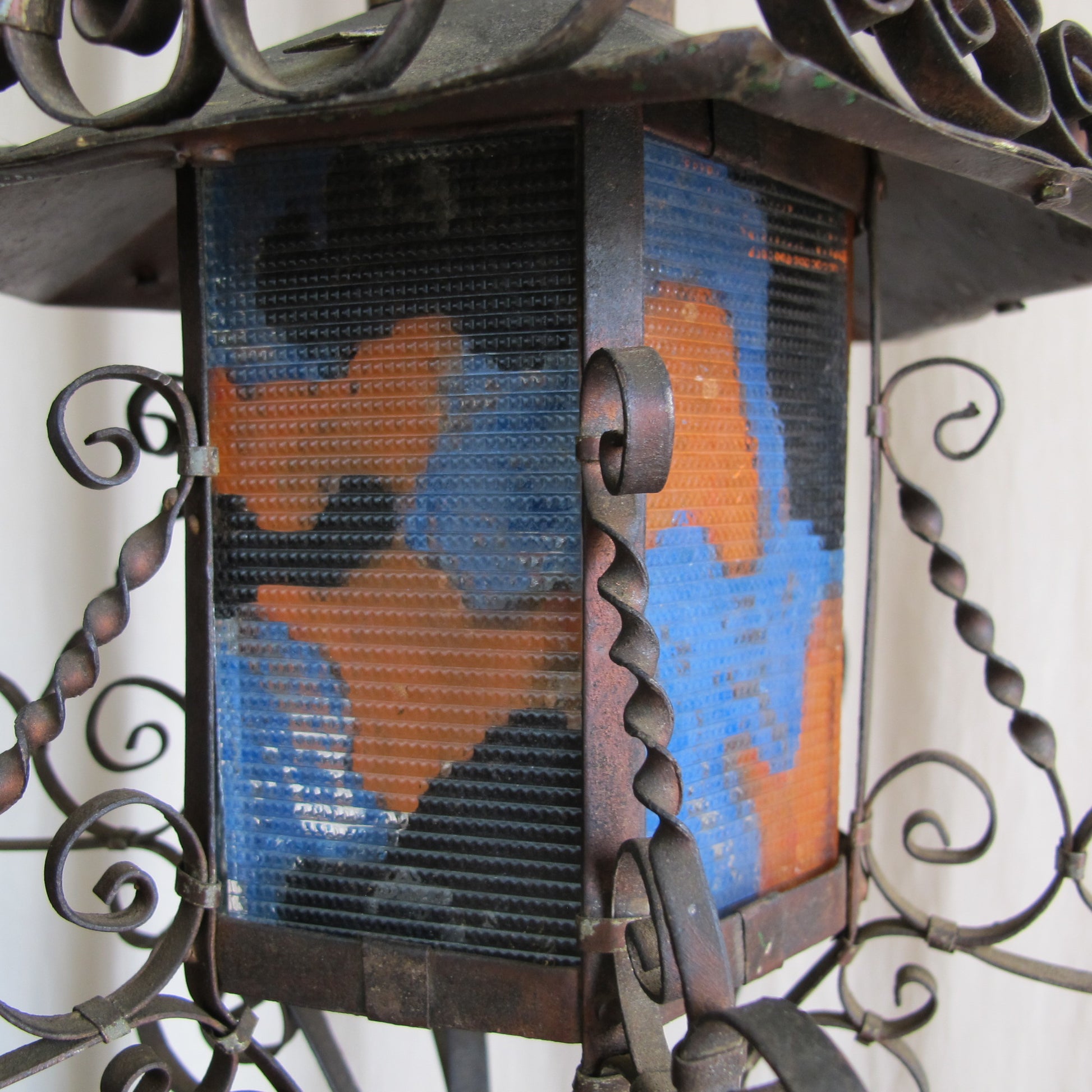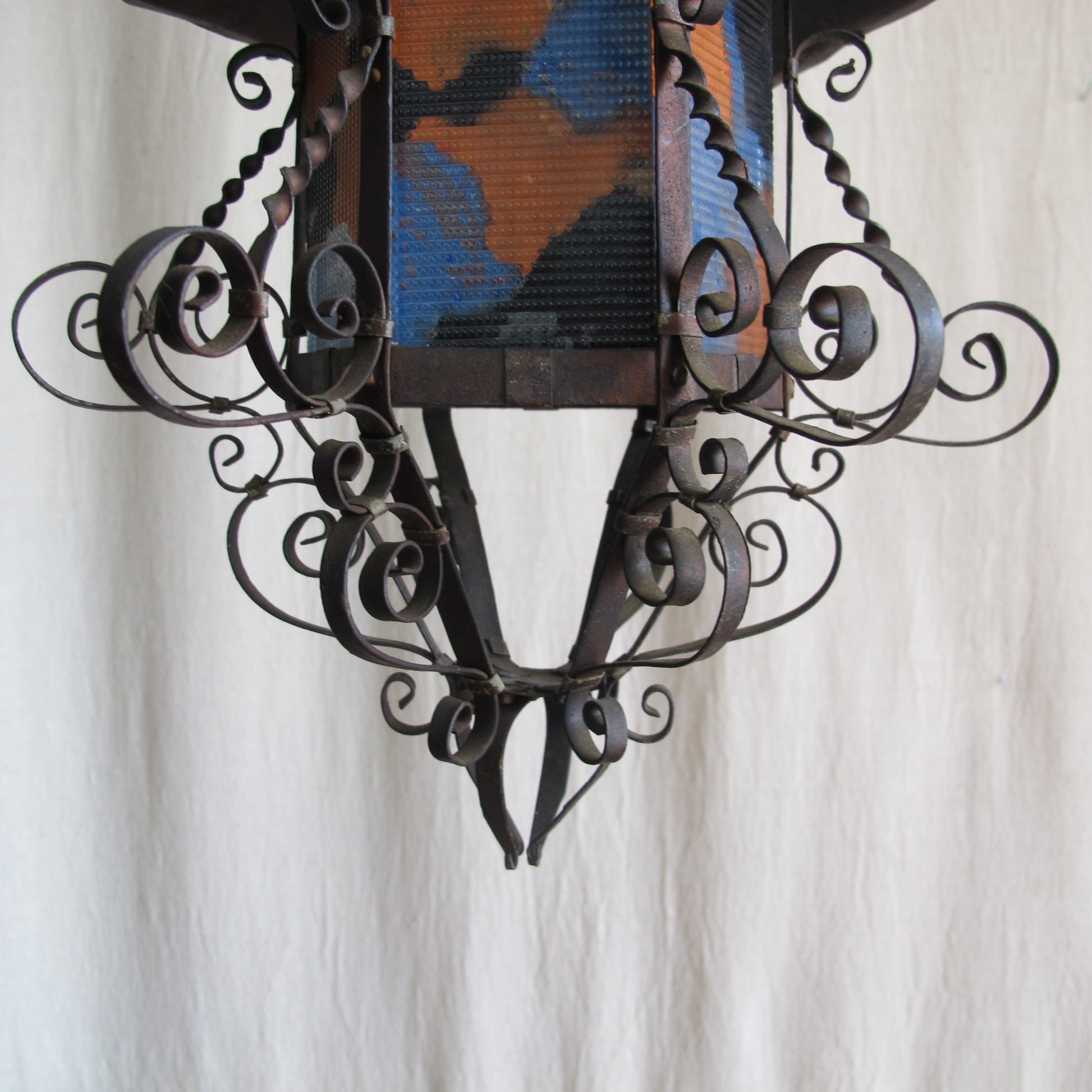 Rare 1920s California Spanish Colonial lantern in delicately wrought copper and reverse painted glass