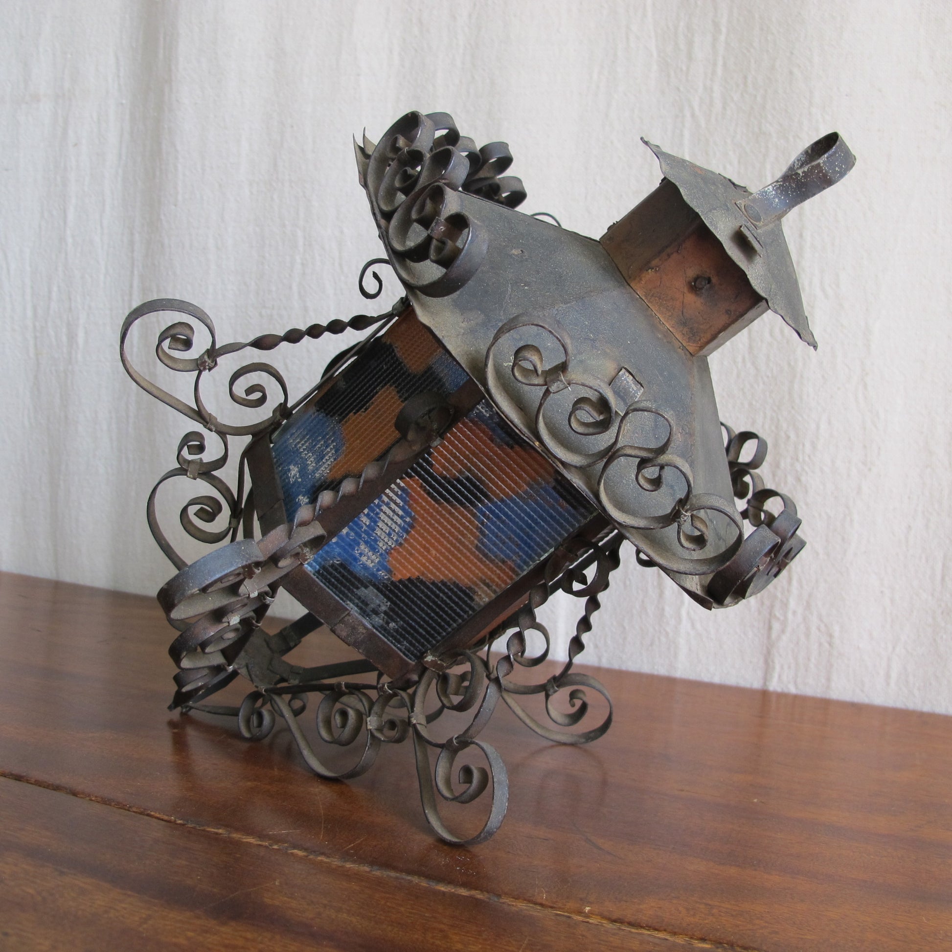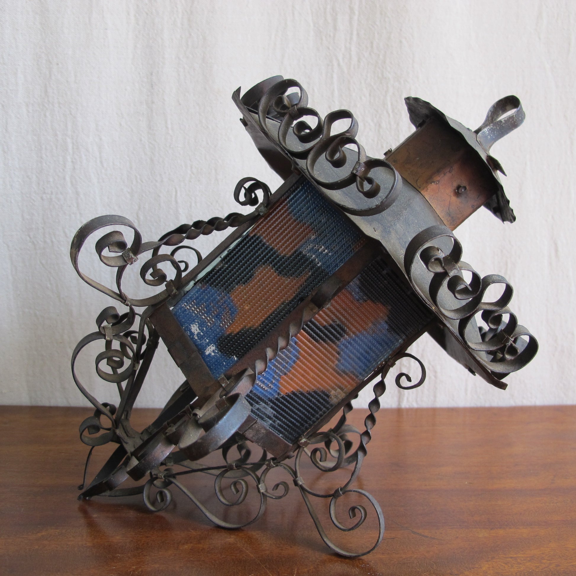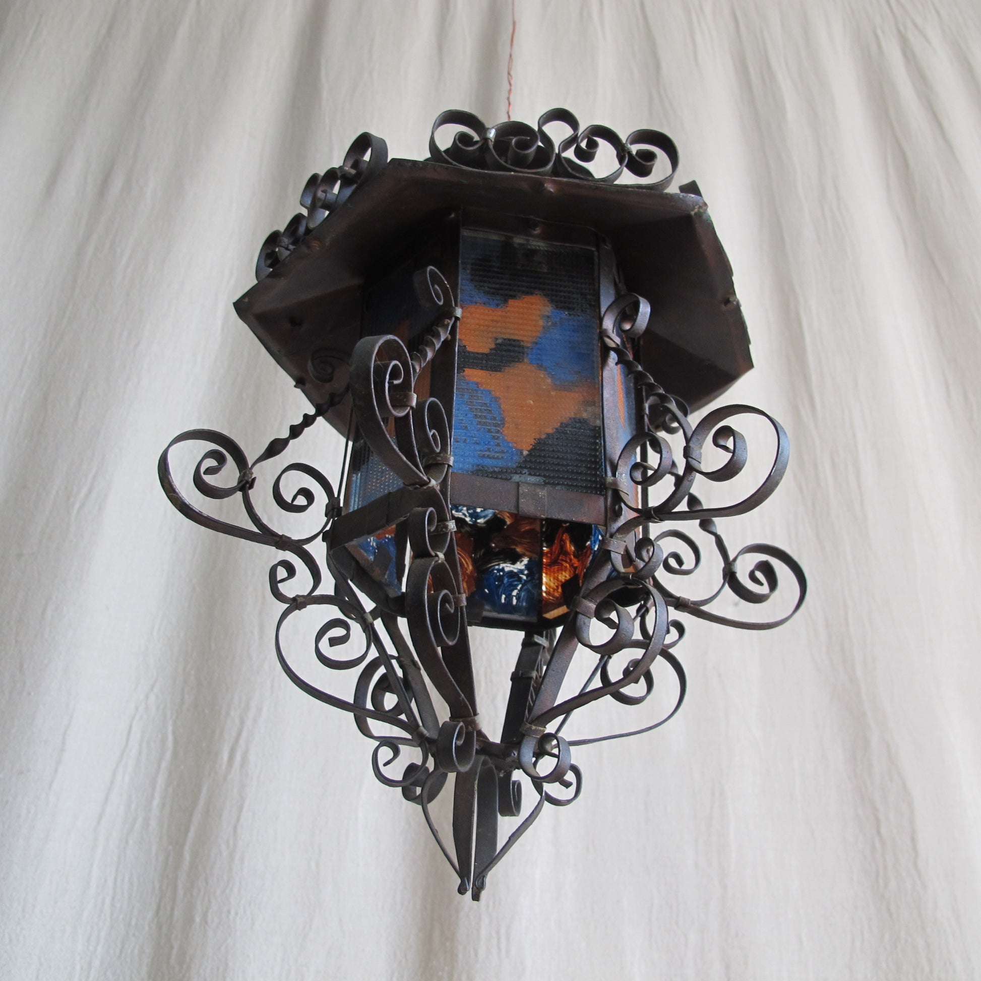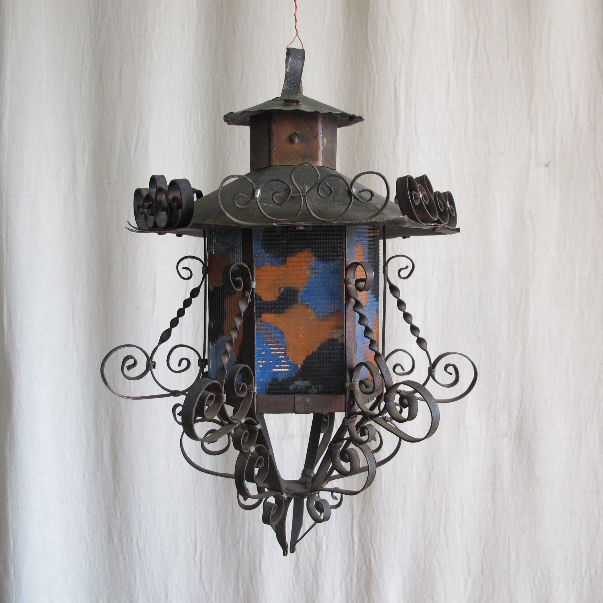 Rare 1920s California Spanish Colonial lantern in delicately wrought copper and reverse painted glass