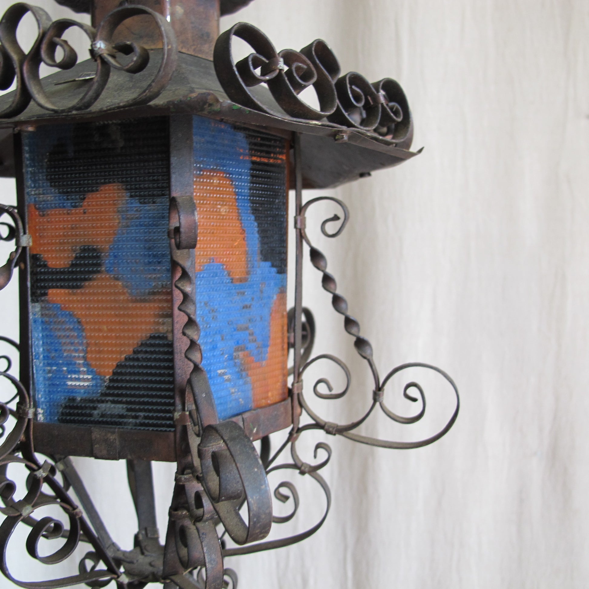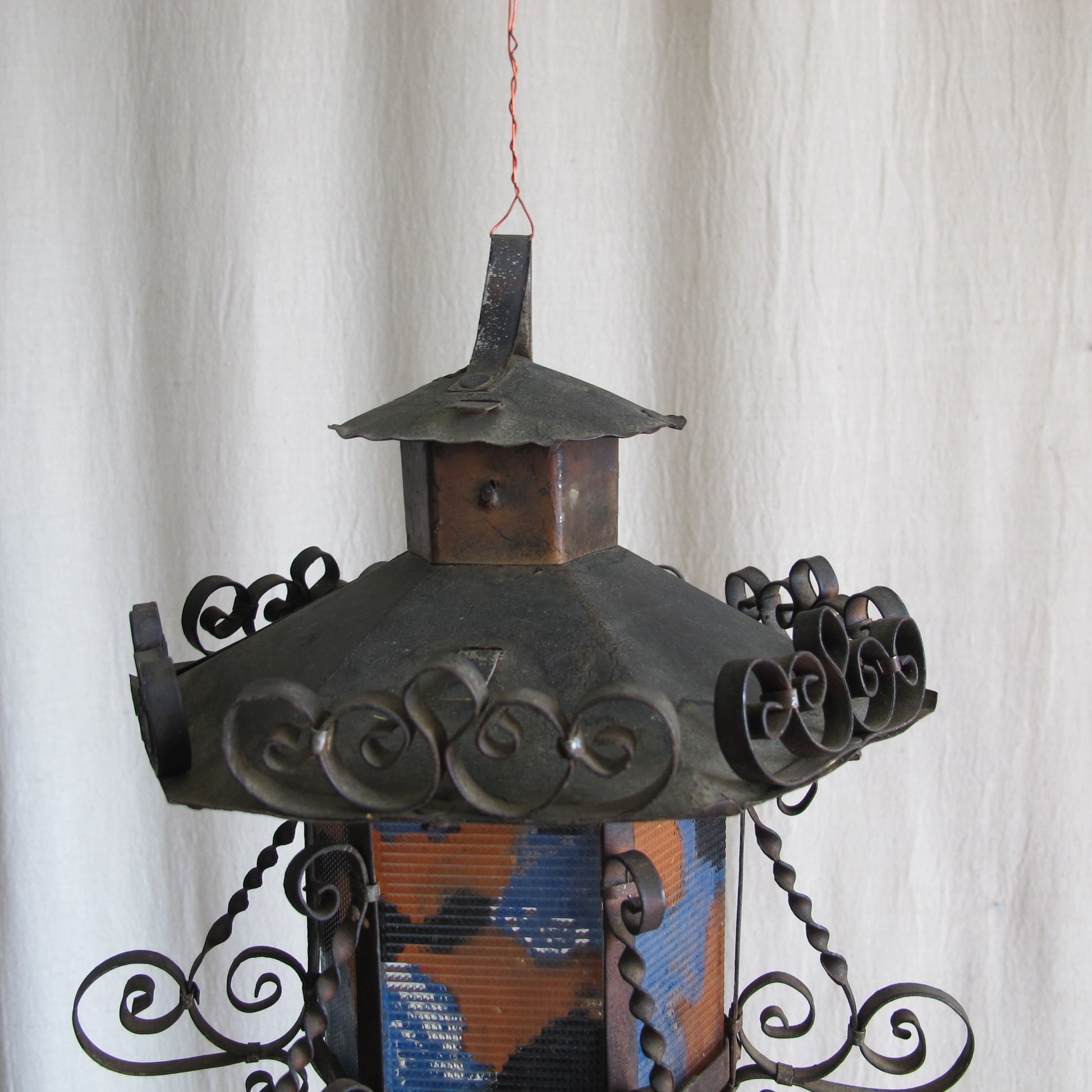 Rare 1920s California Spanish Colonial lantern pendant light in delicately wrought copper and reverse painted glass in a sort of camouflage pattern, suitable for indoors or sheltered outdoors, minor losses as noted to some ornaments. Not currently wired, but could easily be redone.