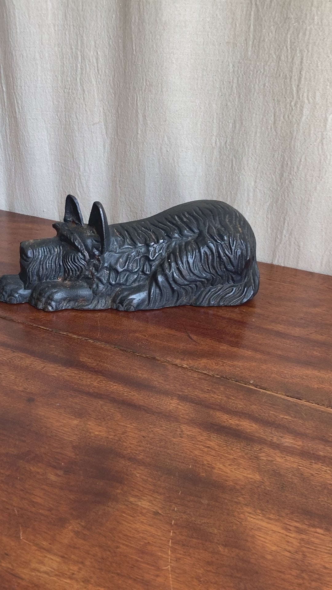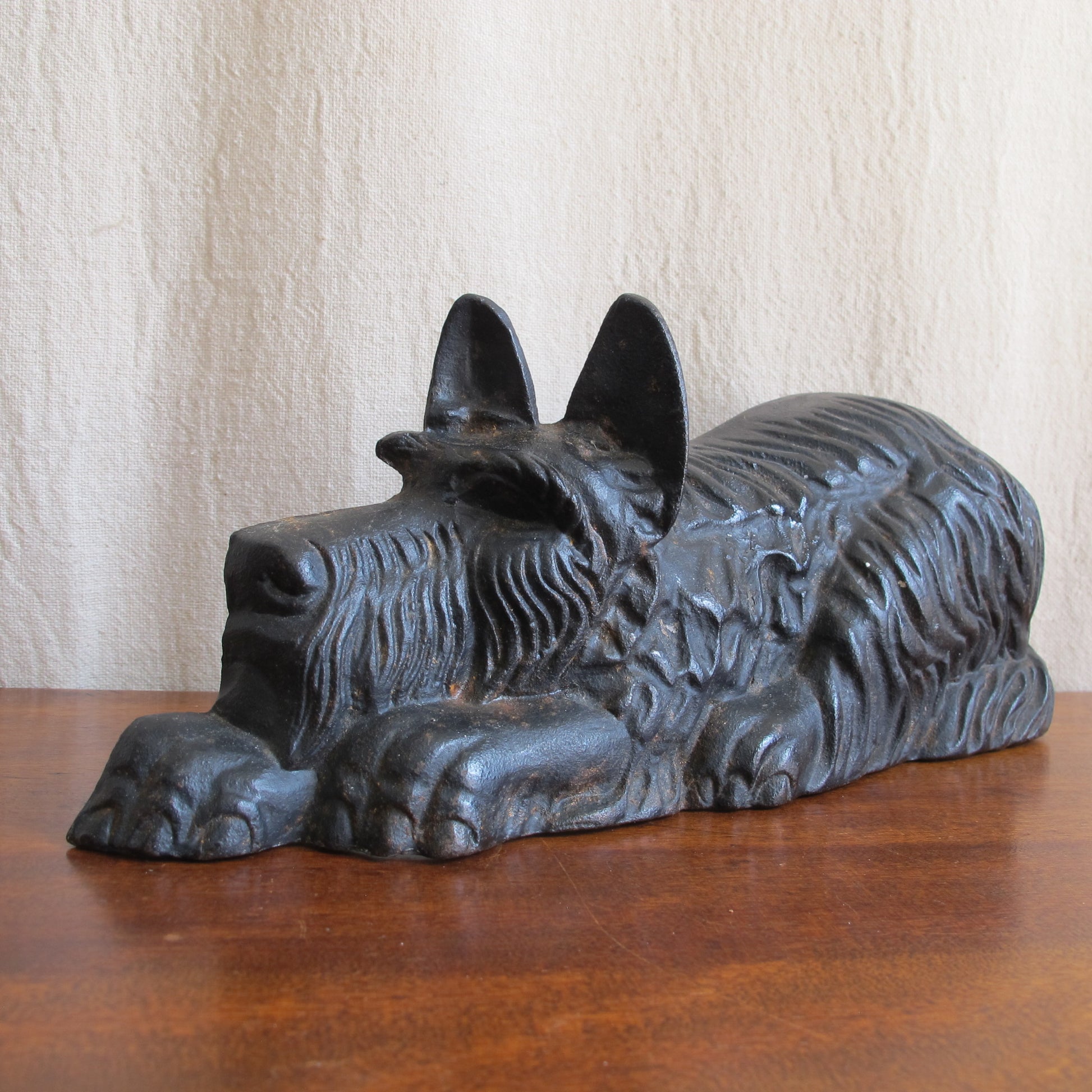 Recumbent Scottie cast iron dog doorstop, 1920 1930 vintage antique