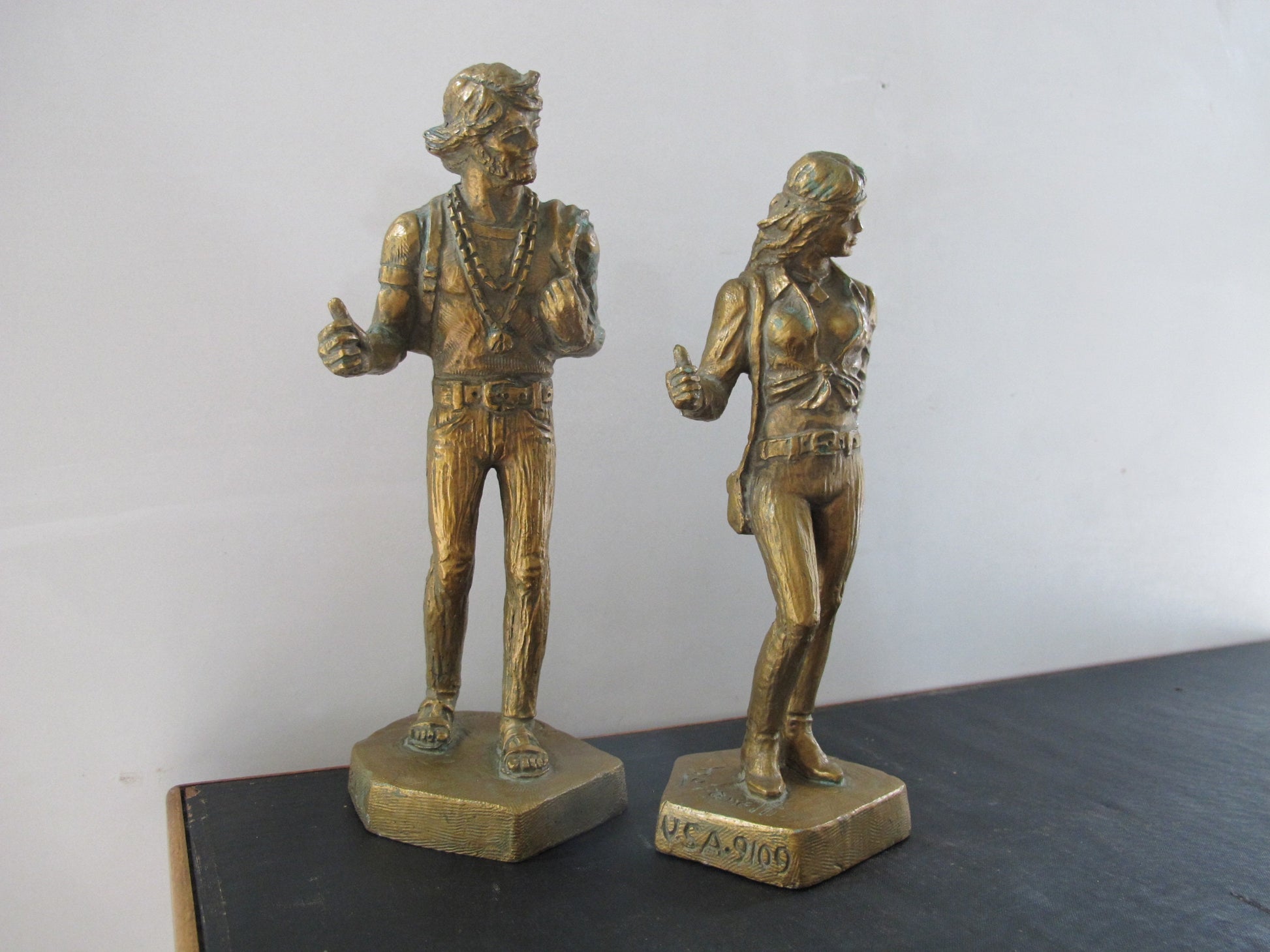Sculptures Hitchikers Man and Woman Romanelli Jostens USA 9108 9109 Bronze Resin 1960s 1970s MCM Midcentury