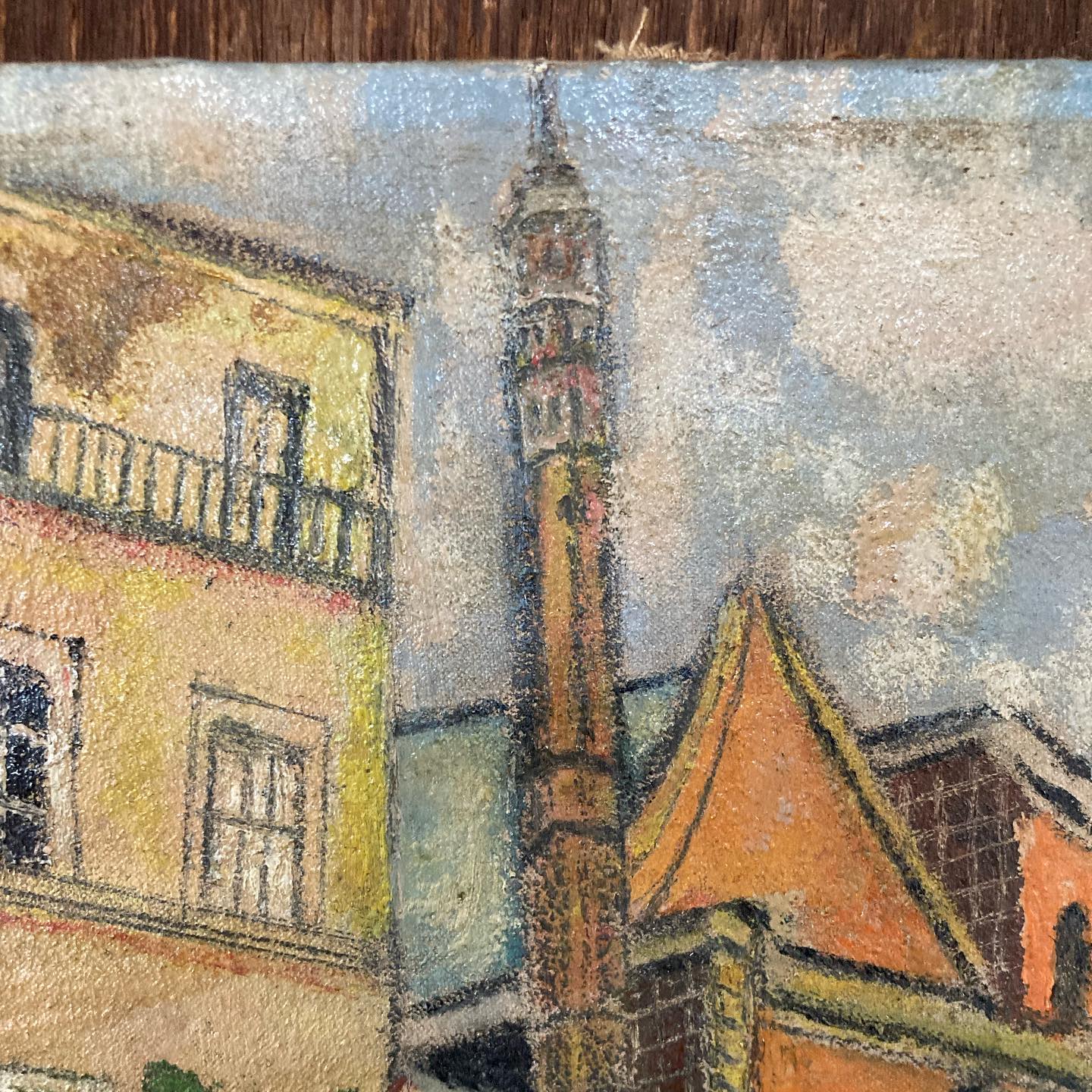 Small naive oil on canvas painting, French or more likely North African, possibly Algeria, Morocco or Egypt, with minaret, c. 1930