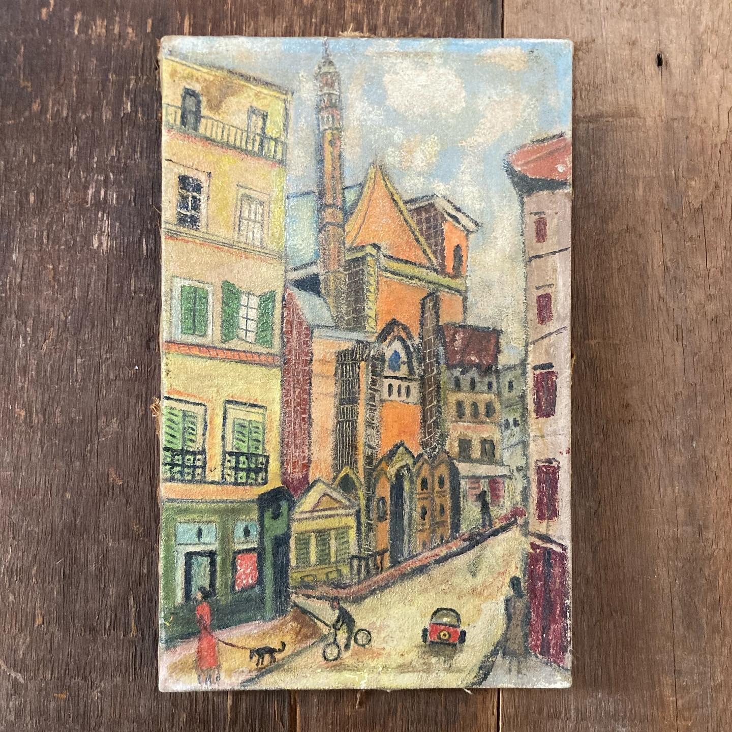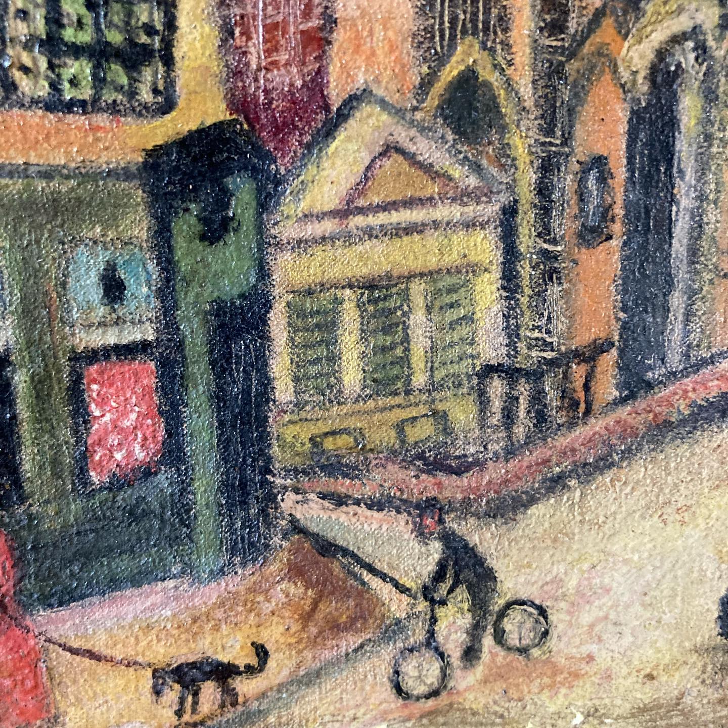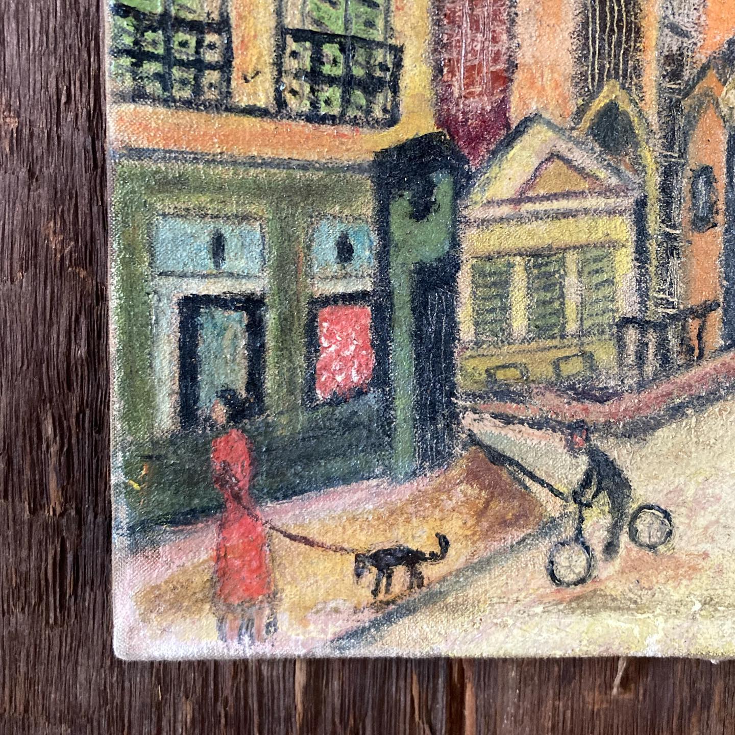 Small naive oil on canvas with sgraffito linework and sand added to the pigments, French or more likely North African, possibly Algeria, Morocco or Egypt -- depicting French Colonial architecture, with marvelous tiny figures (woman with dog is my favorite), along with what appears to be the spire of a minaret, c. 1930, excellent condition if a bit grimy, 13.75" T x 8.625" W, $695.