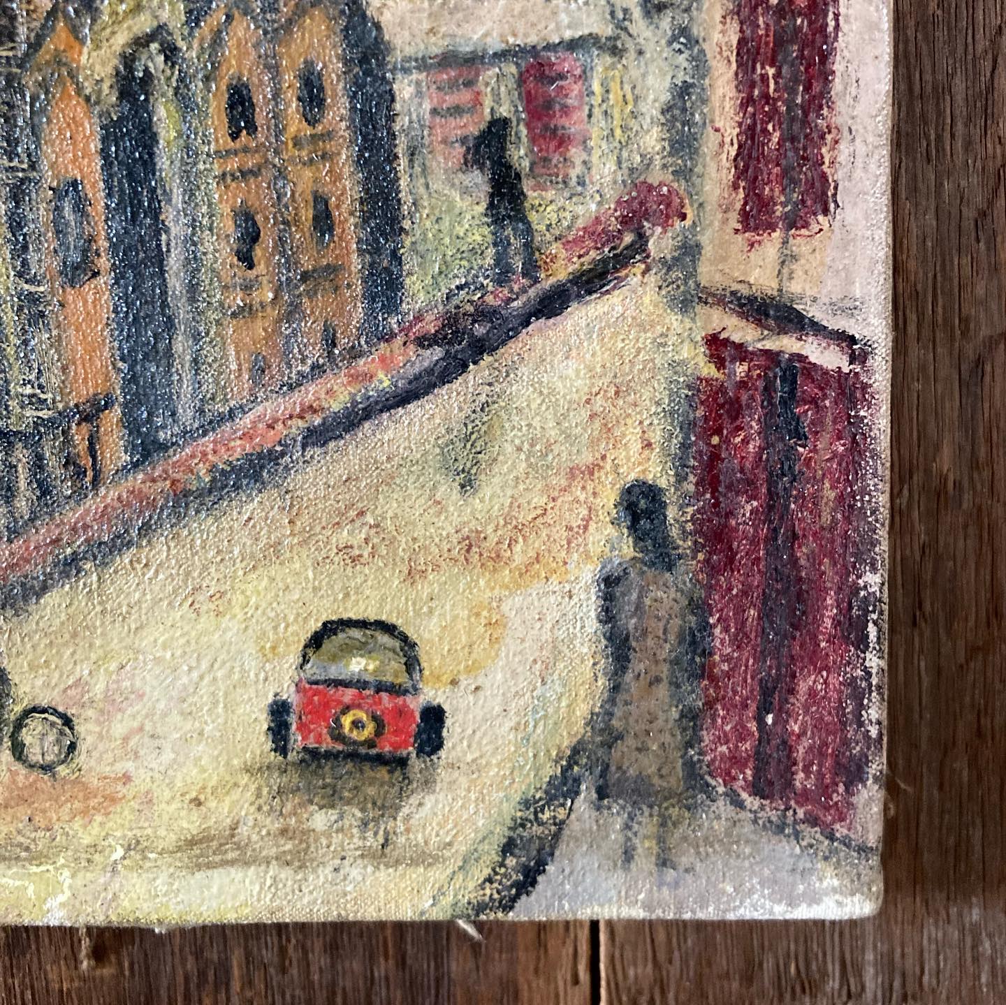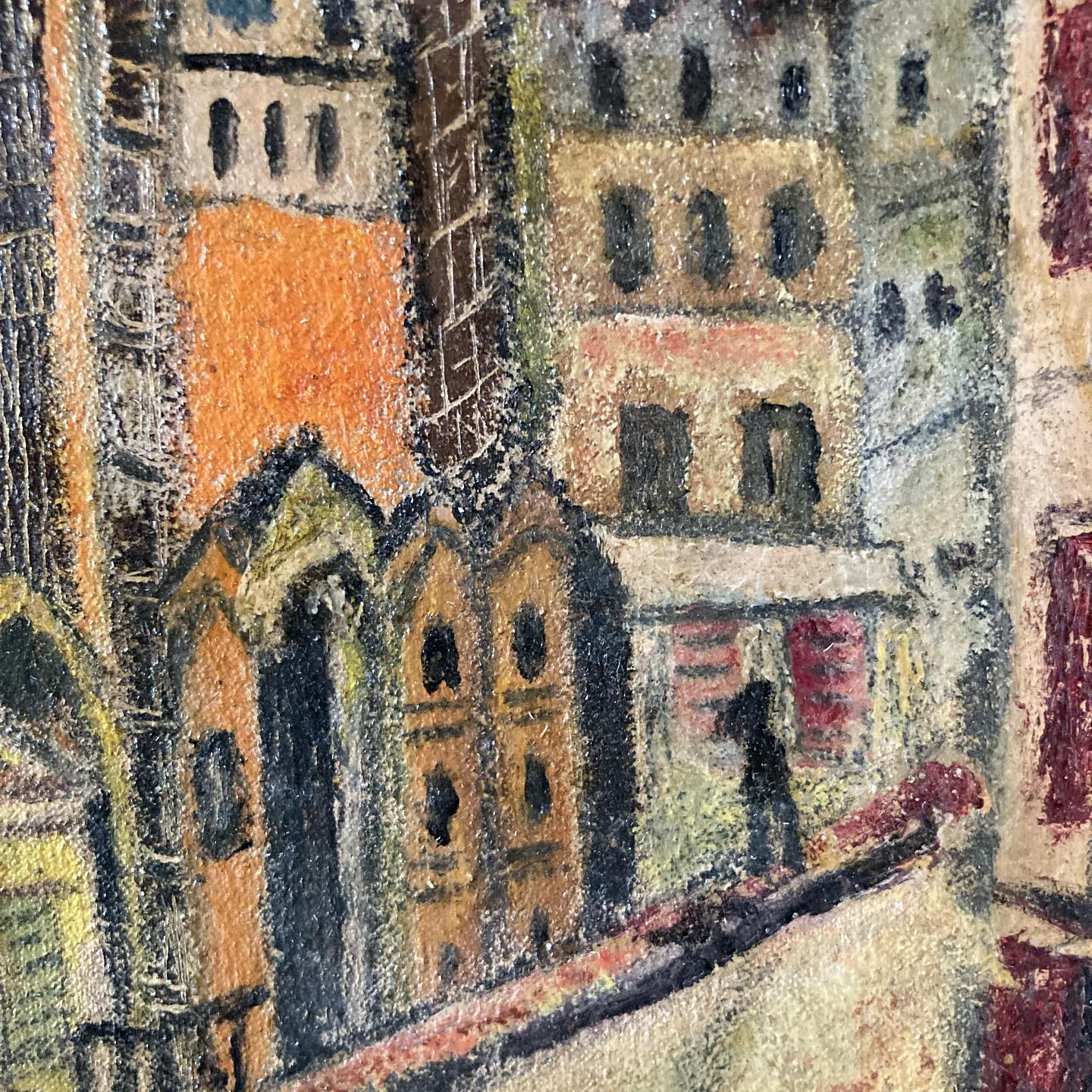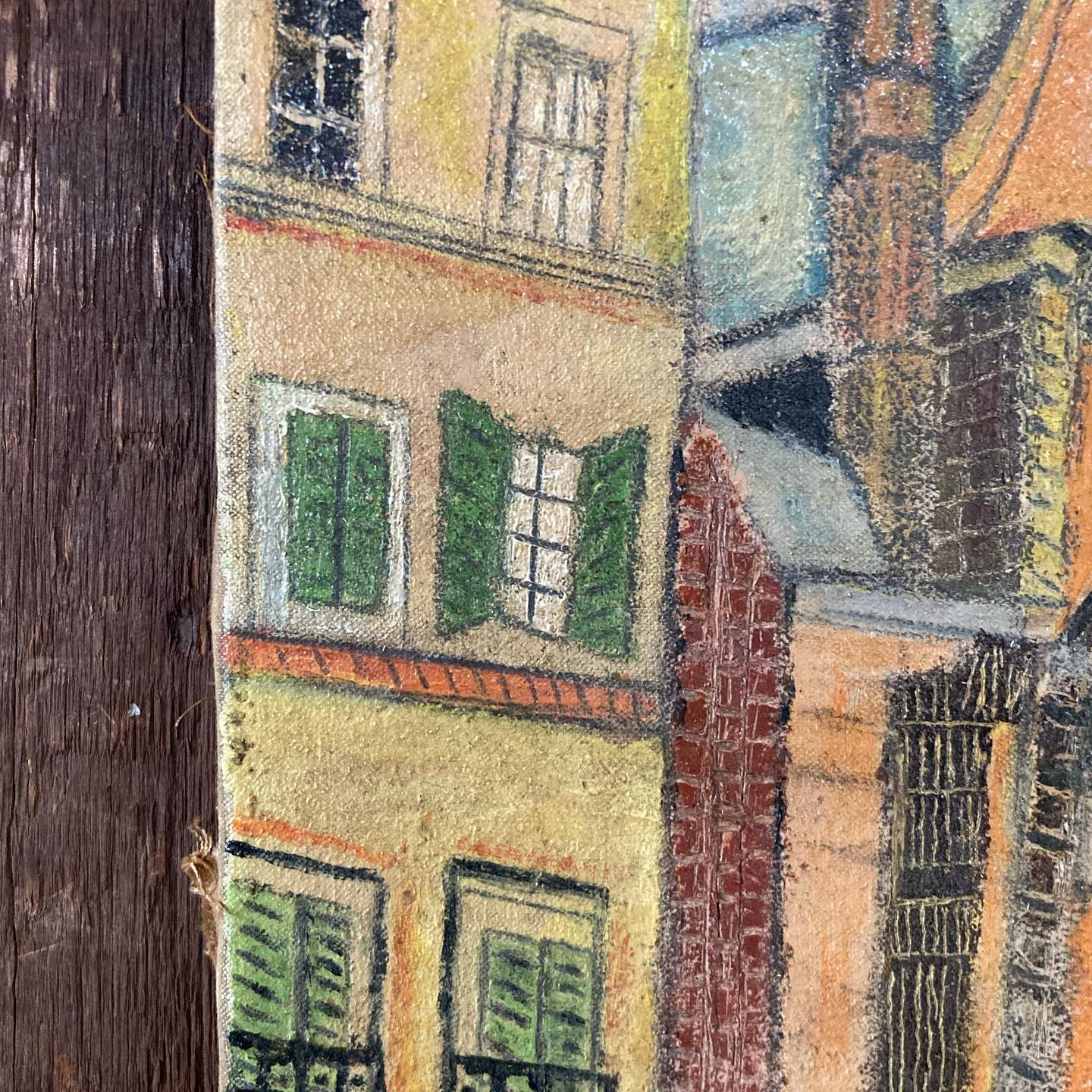 Small naive oil on canvas with sgraffito linework and sand added to the pigments, French or more likely North African, possibly Algeria, Morocco or Egypt -- depicting French Colonial architecture, with marvelous tiny figures (woman with dog is my favorite), along with what appears to be the spire of a minaret, c. 1930, excellent condition if a bit grimy, 13.75" T x 8.625" W, $695.