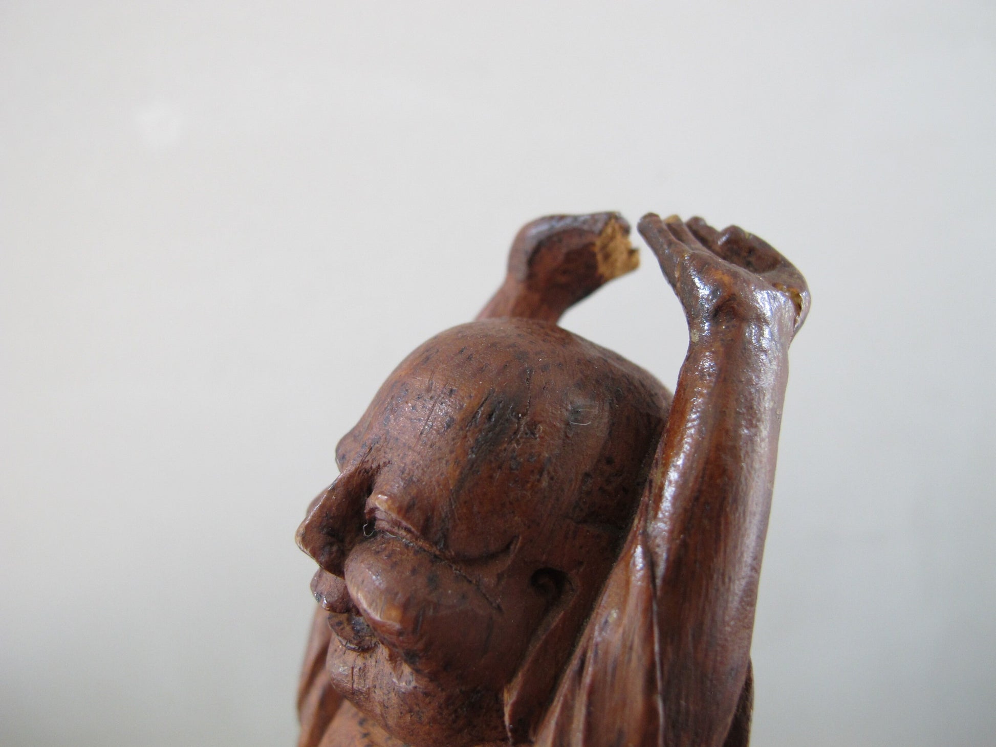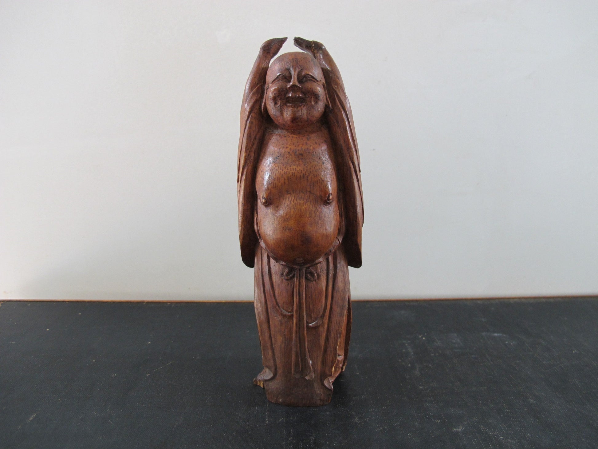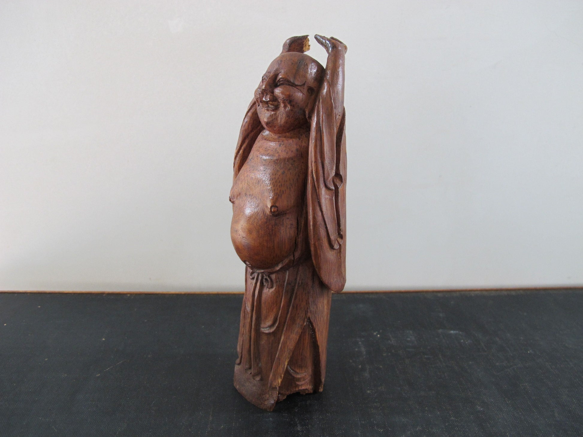 Smiling Buddha Stretching Chinese Carved Bamboo Antique 1920s 1930s Statue Figure Figurine