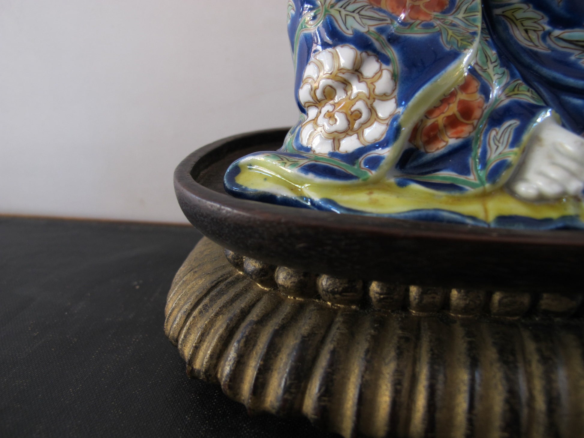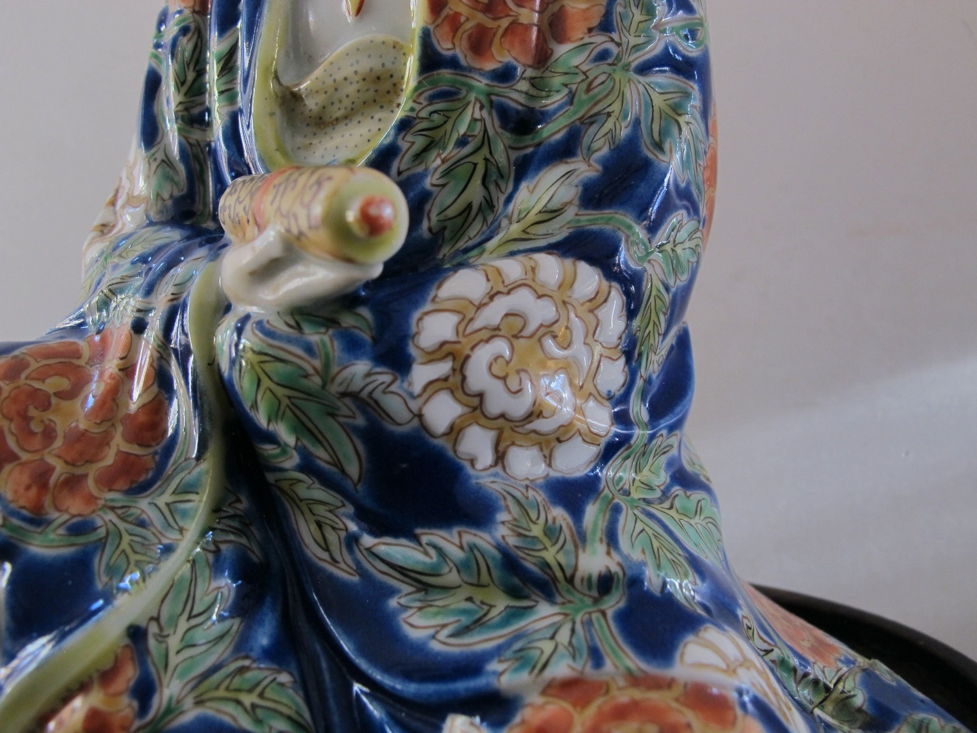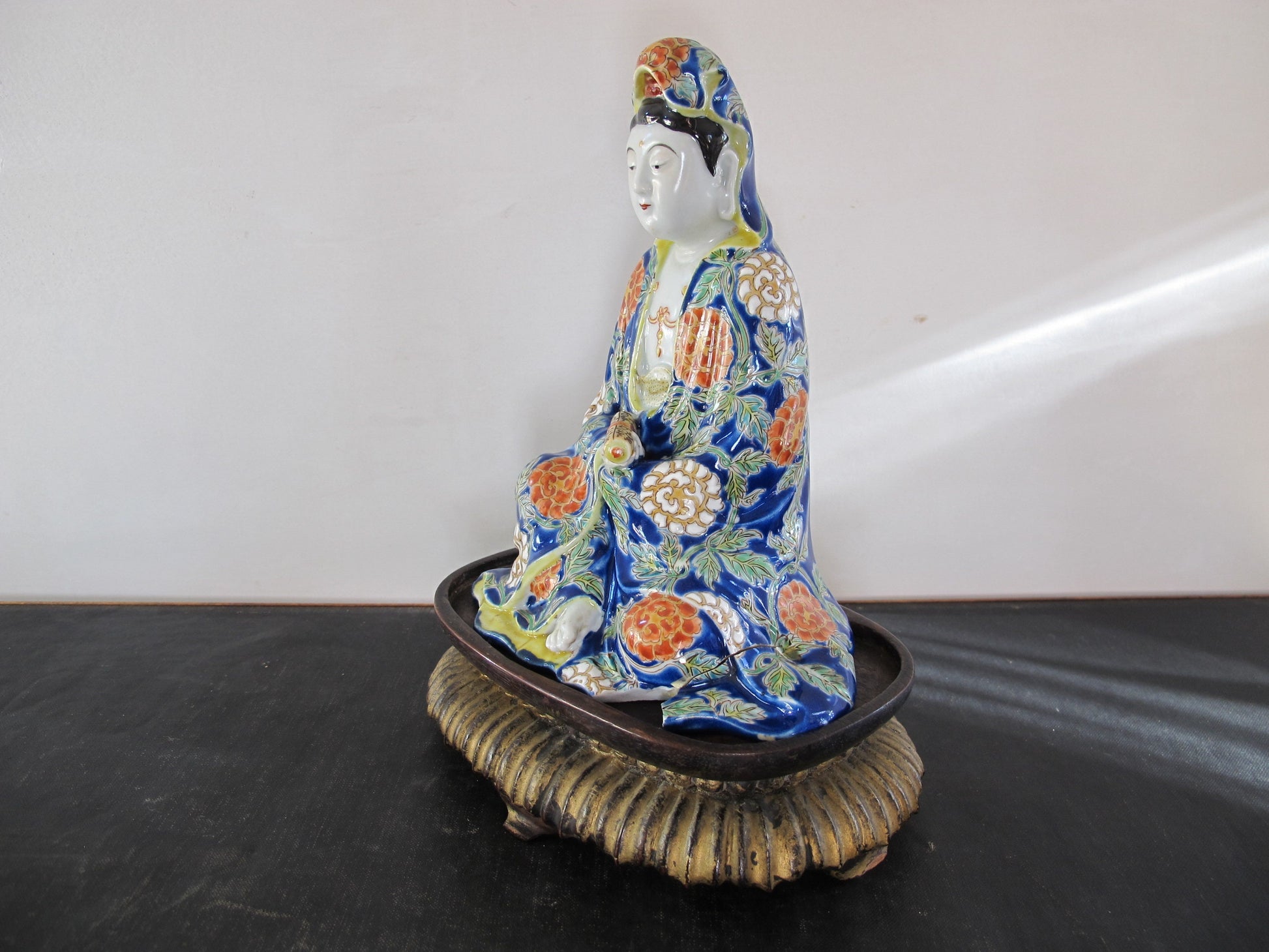 Statuette Guanyin Famille Bleu Chinese Polychrome Buddhist Bodhisattva Porcelain c. 1900 on Lotus Stand Skinner Auctions Tag