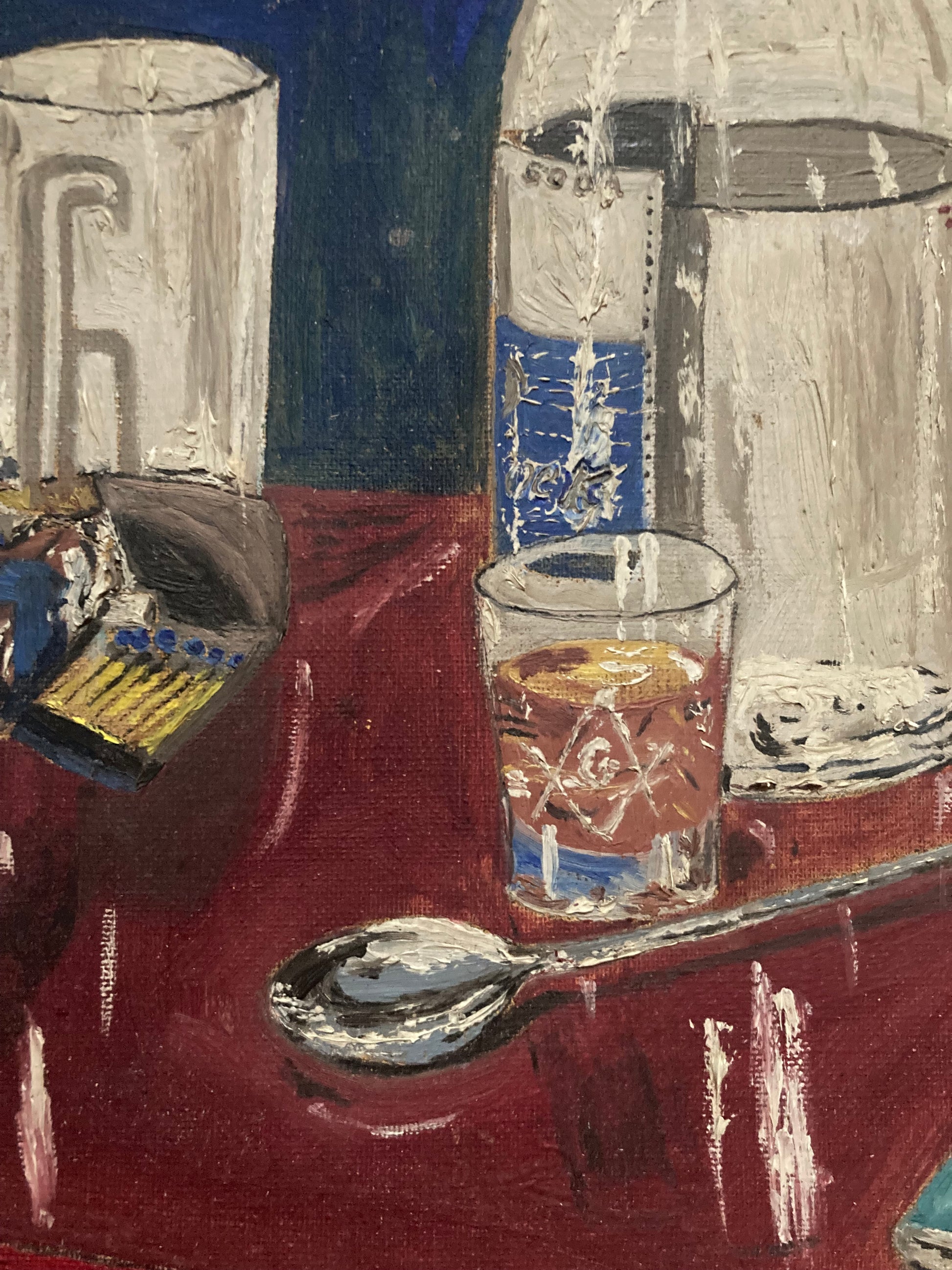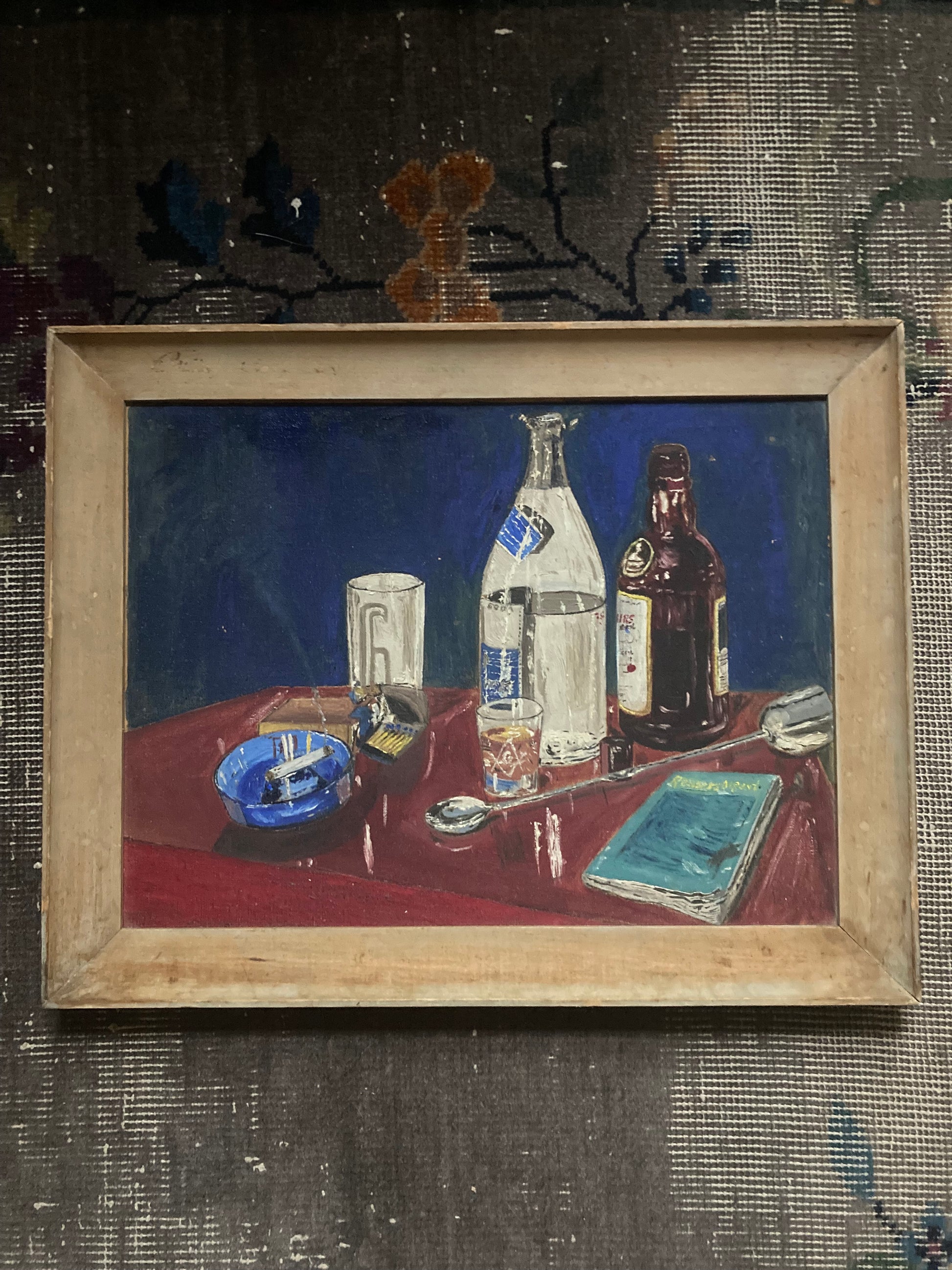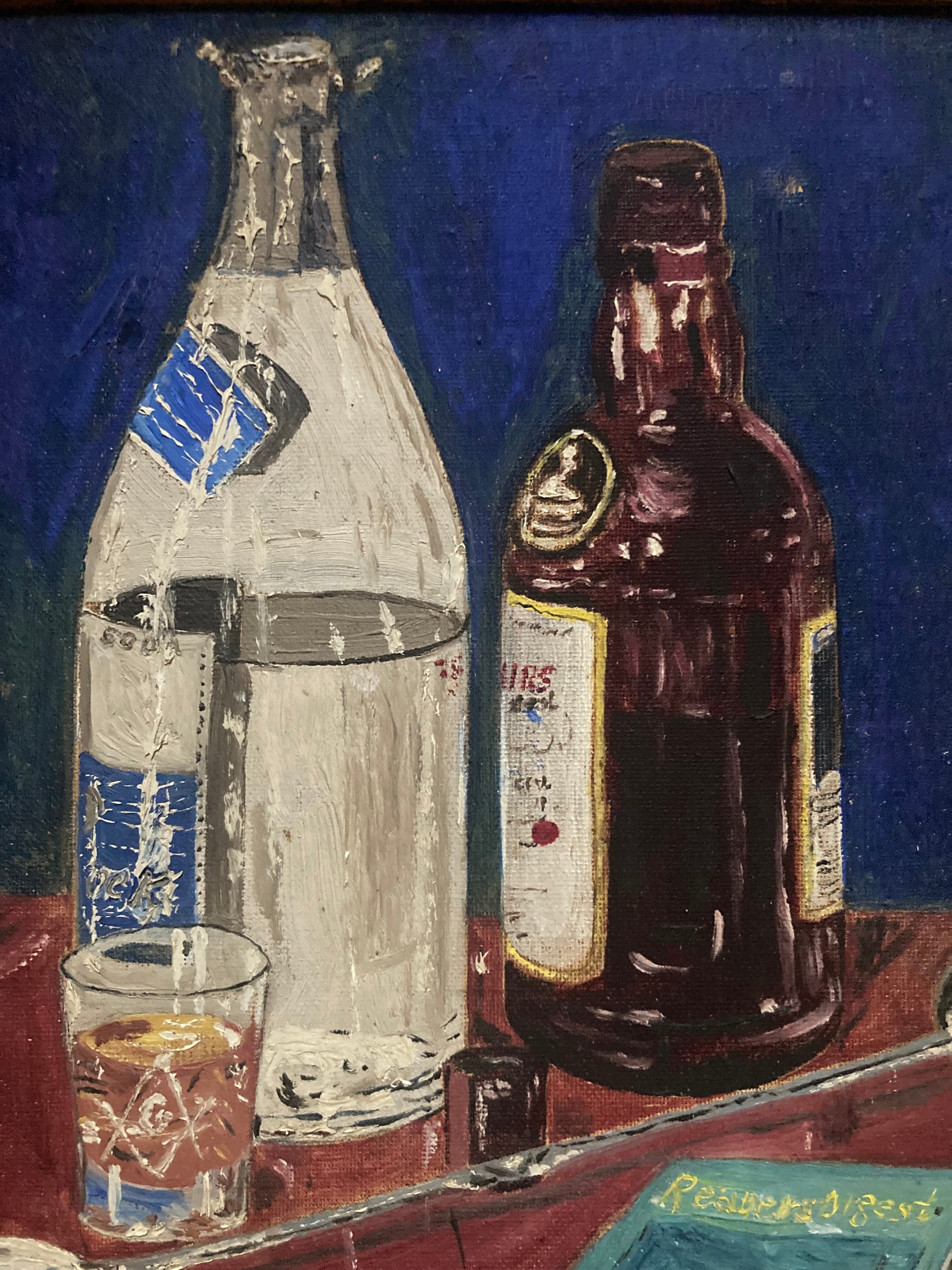 Still Life Painting Naive 1950s Smoking Cigarette with Liquor Bottles and Dogeared Readers Digest and Masonic Symbols