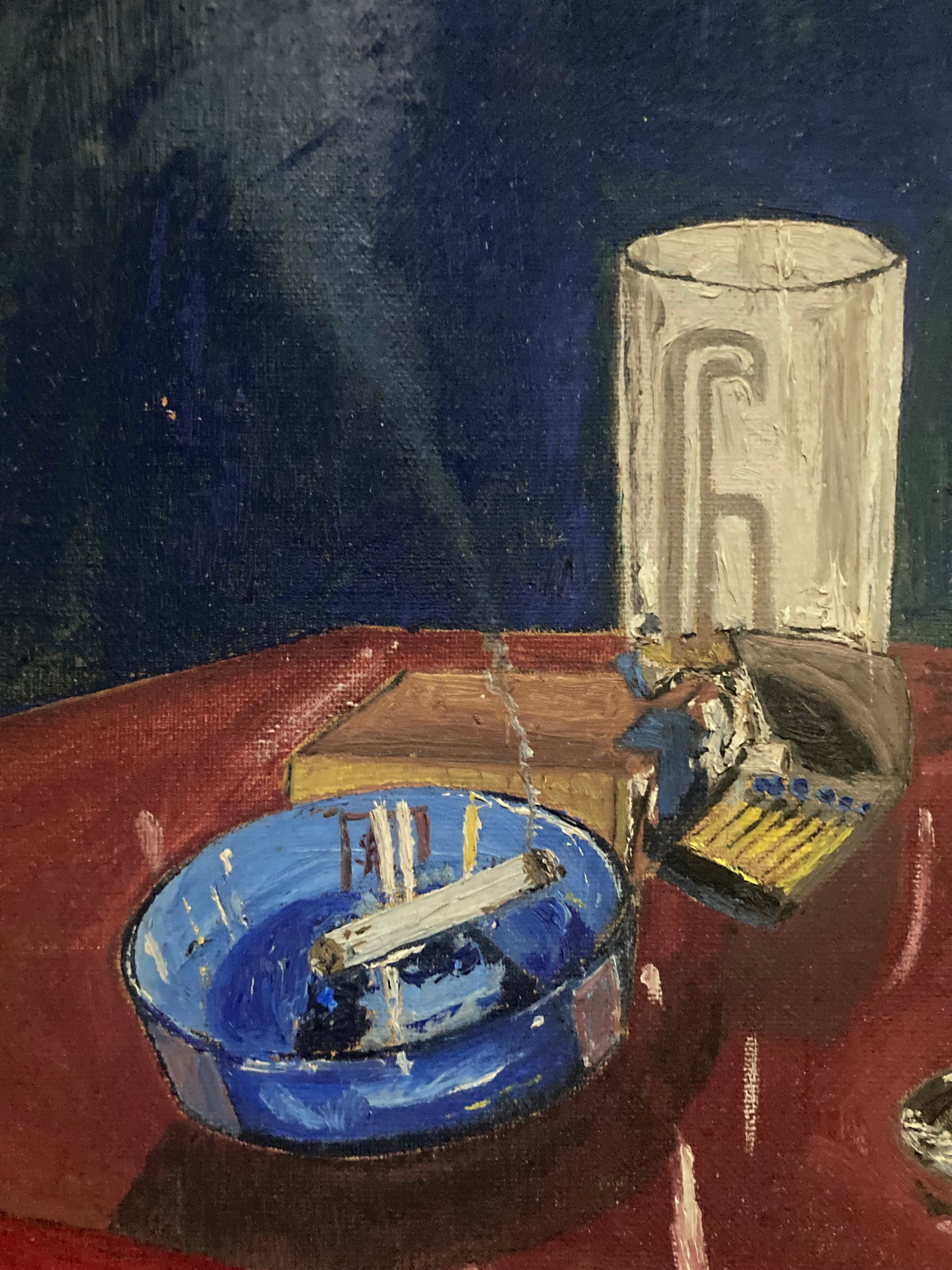 This naive painting is set on broad plains colored in deepest blue and blood red, while the objects are covered in recognizable iconography: from the dog-eared ‘Readers Digest’ to the cigarettes to the liquor and soda bottle to the Masonic shot glass. Interesting technical choices as well — the smoke from the cigarette is actually absence of color in the background. This is naive at its best. Measures 14.5” T x 14.25” W.