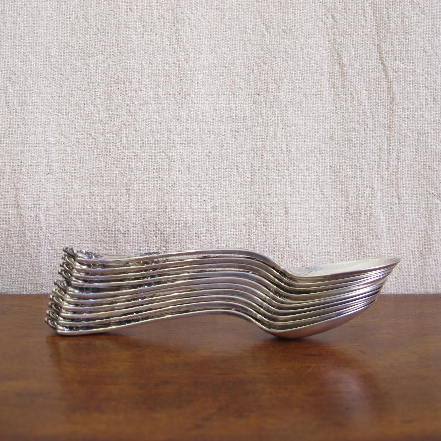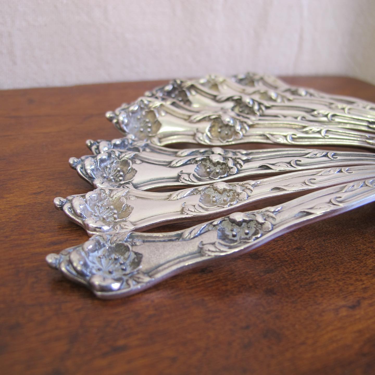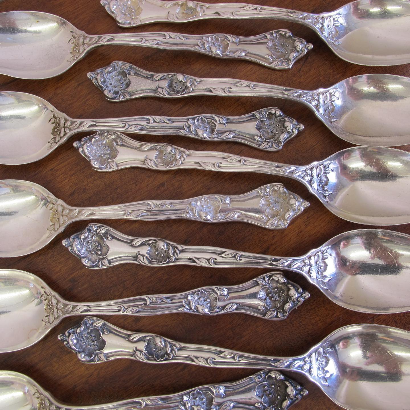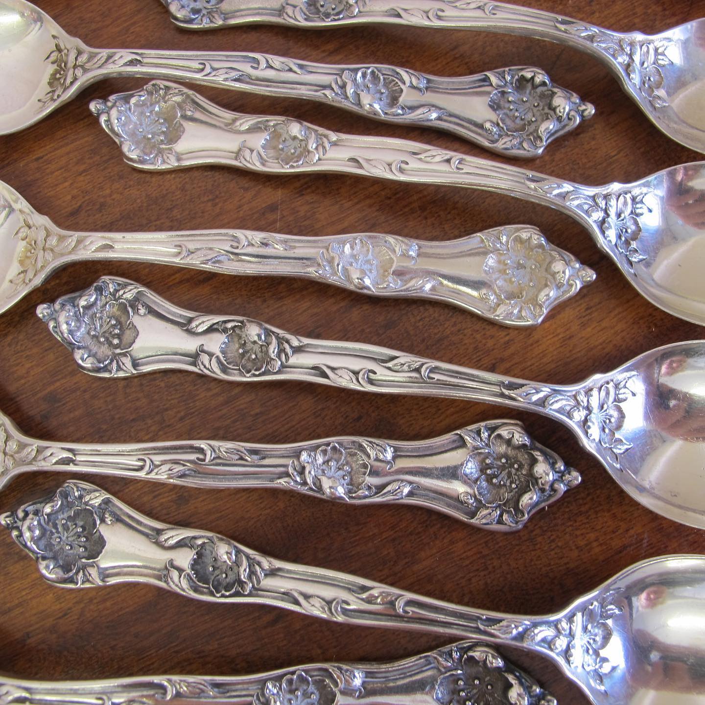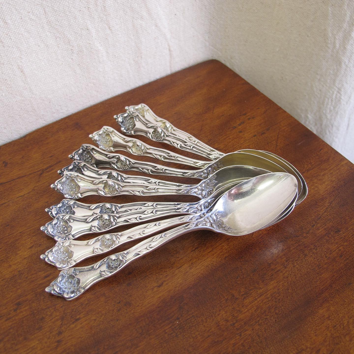 Ten Art Nouveau sterling silver Reed & Barton teaspoons decorated with reliefs of poppies to both the front and back, no monogram, VERY substantial and heavy, c. 1900, each 6” L, together weighing 8.8 oz., seemingly the ‘Poppies’ pattern or possibly the ‘Les 5 Fleurs,’ $345 for all.