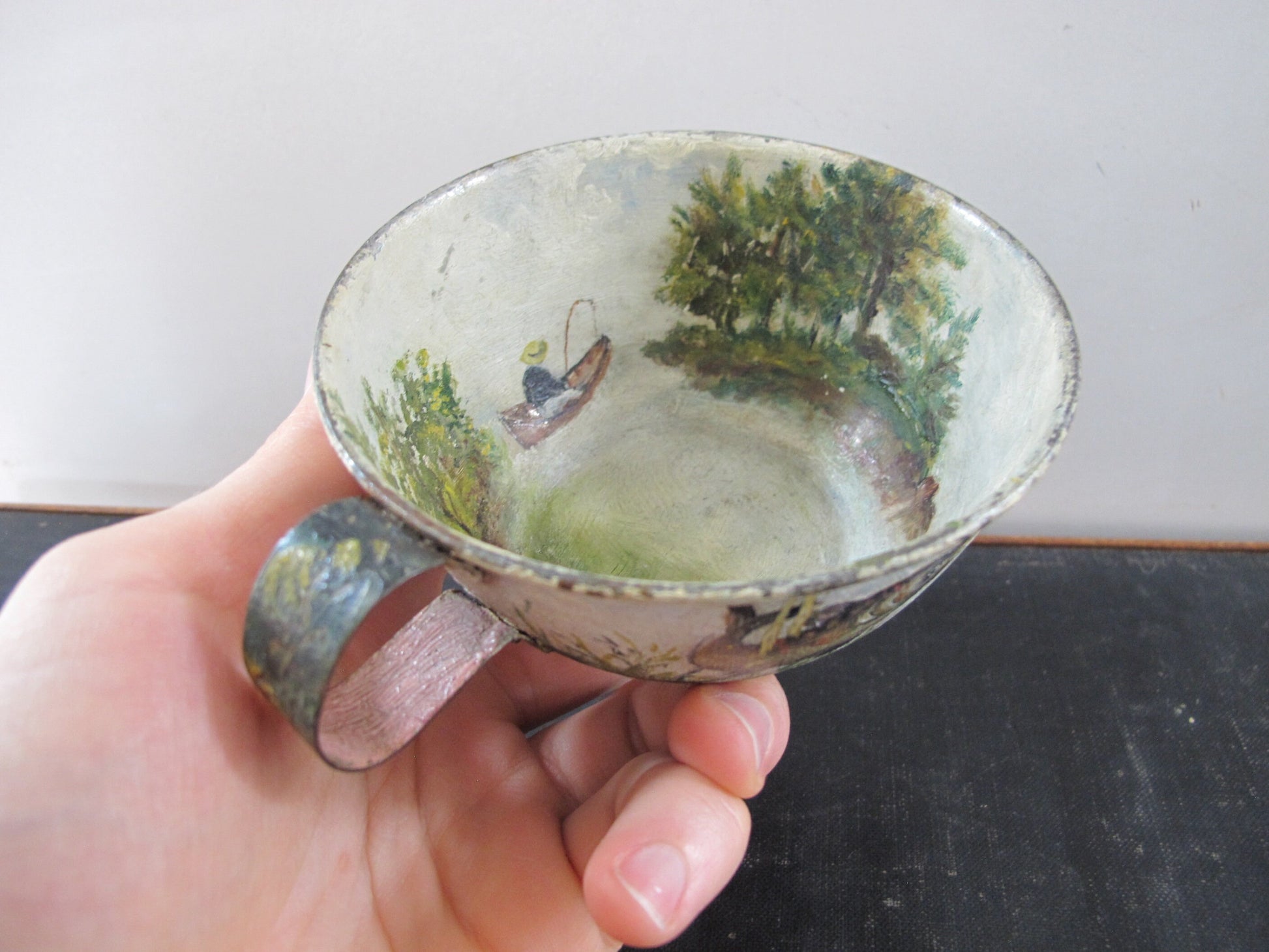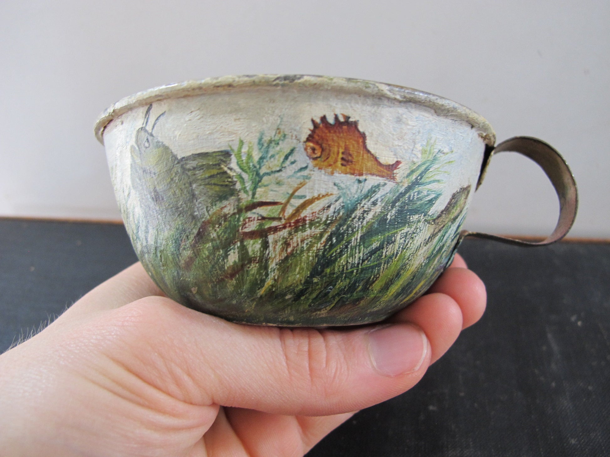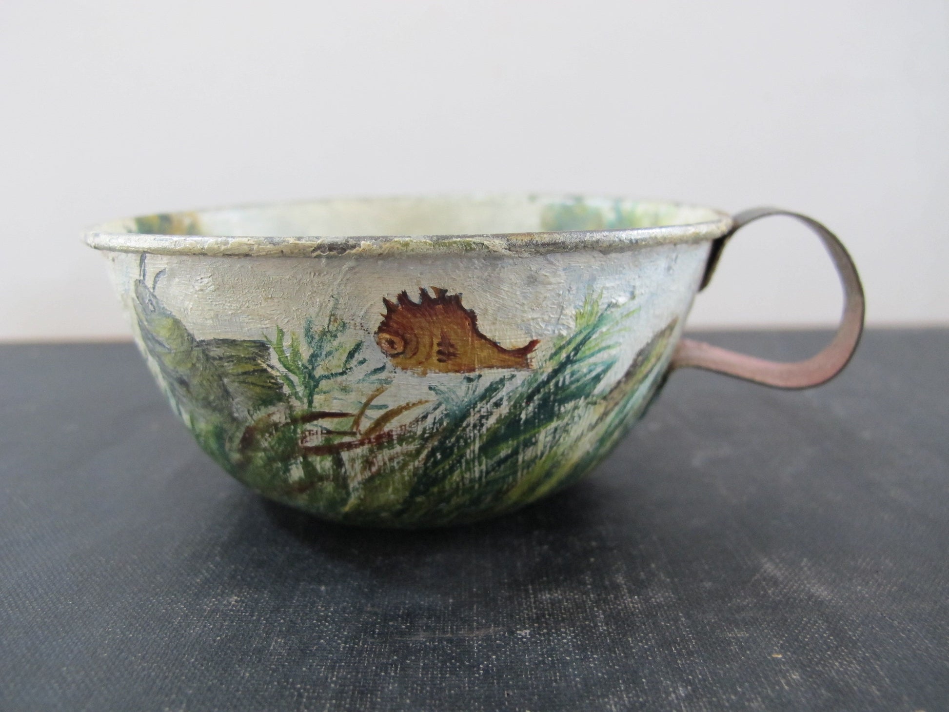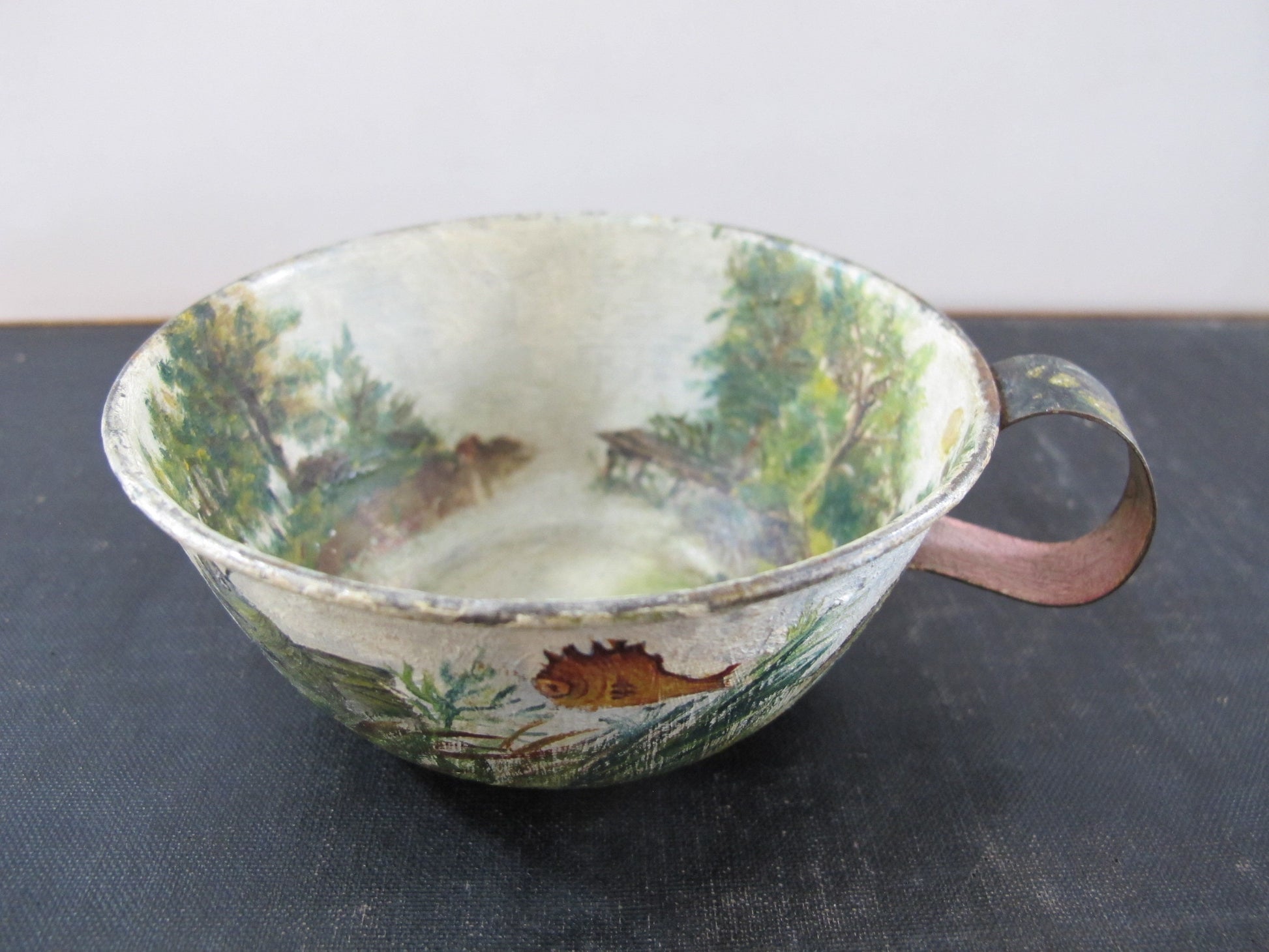 Tole Fishing Teacup Signed Dated 1890s Naive American Folk Art