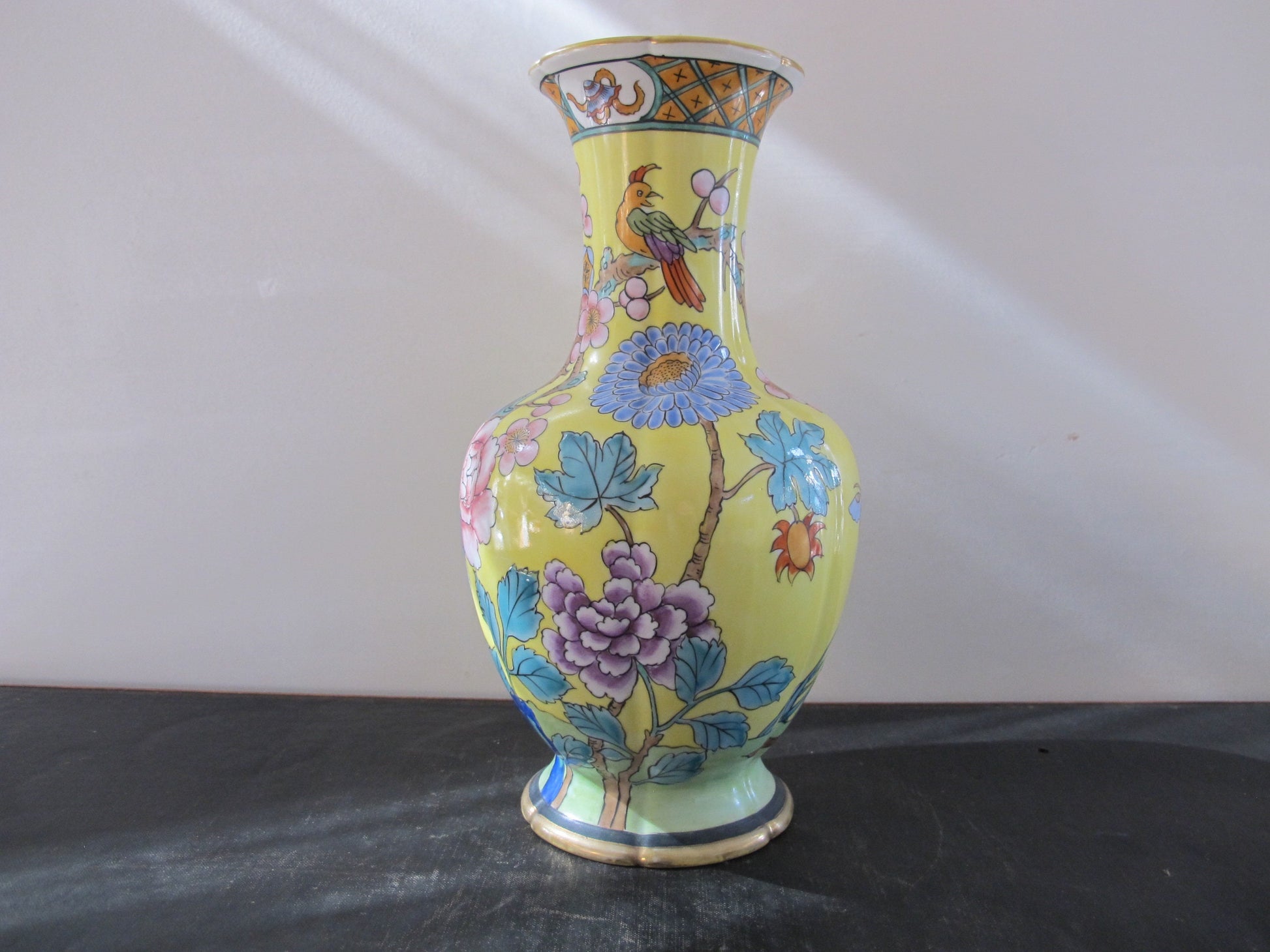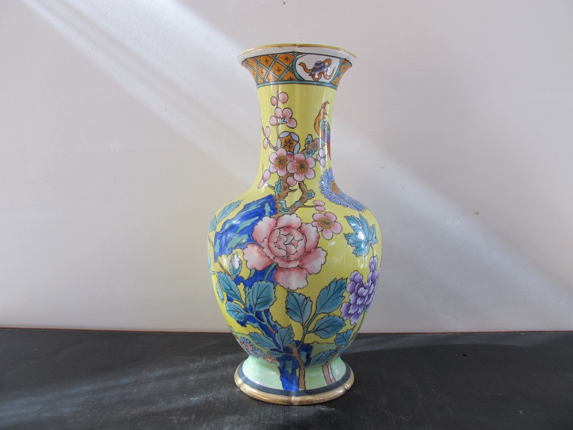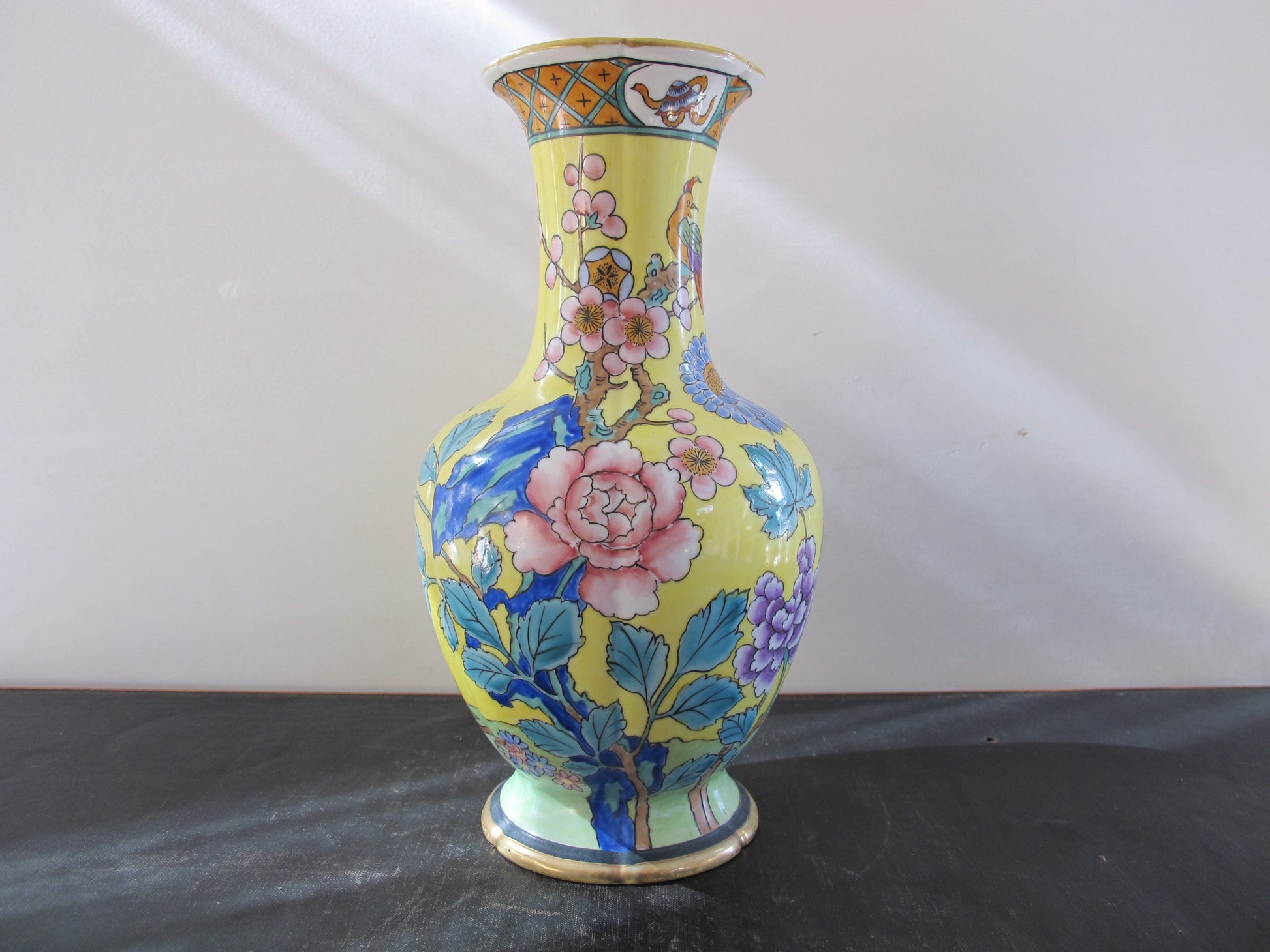 Vase Nippon Prunus Bird of Paradise Camellia Yellow Famille Jaune Japanese in Chinese Style Blue Magenta Teal