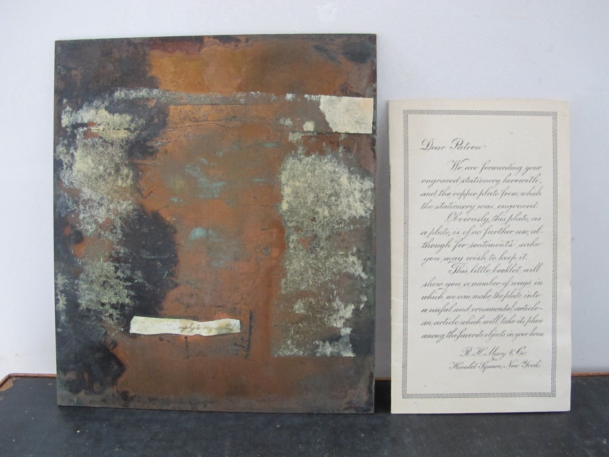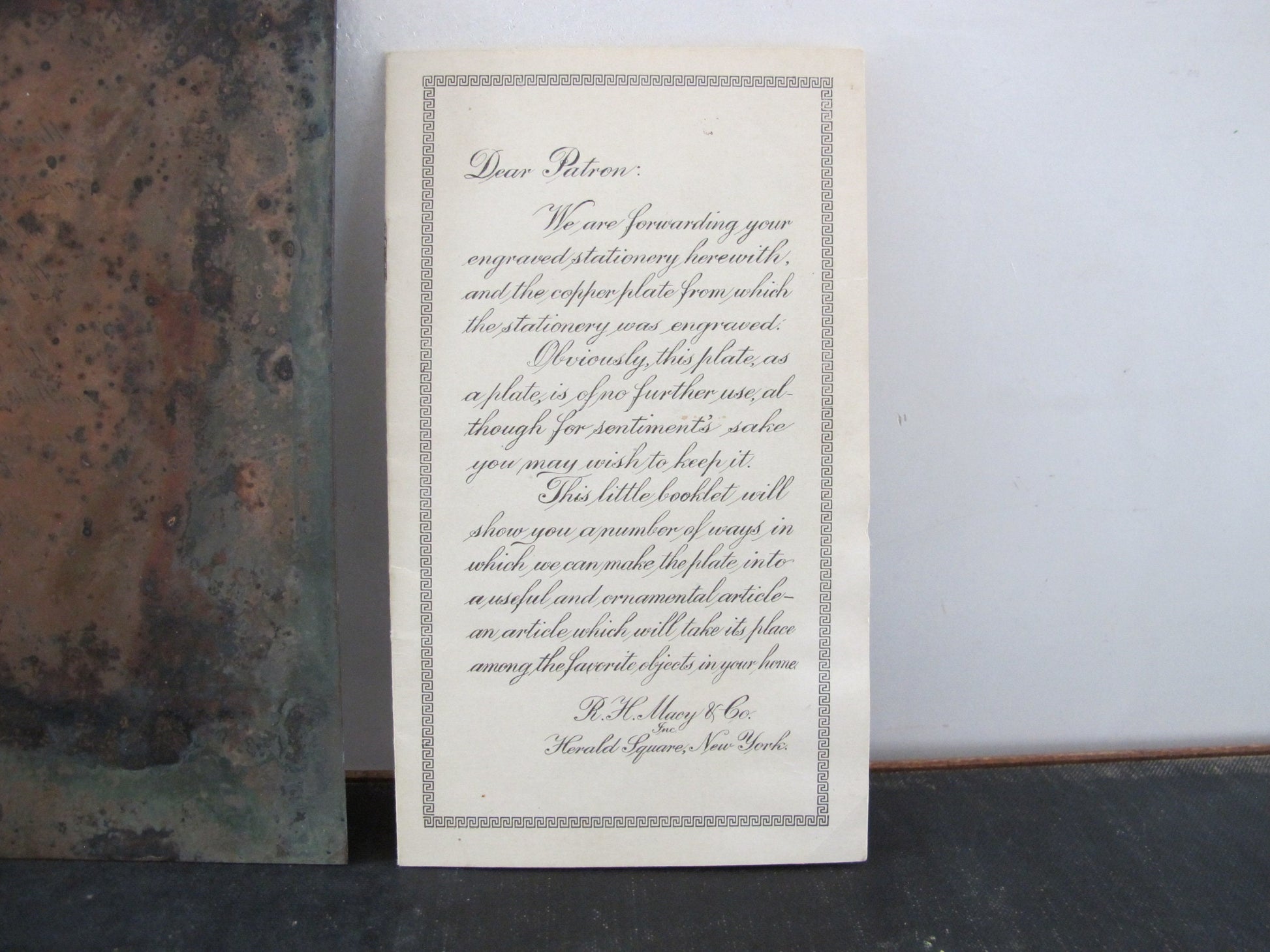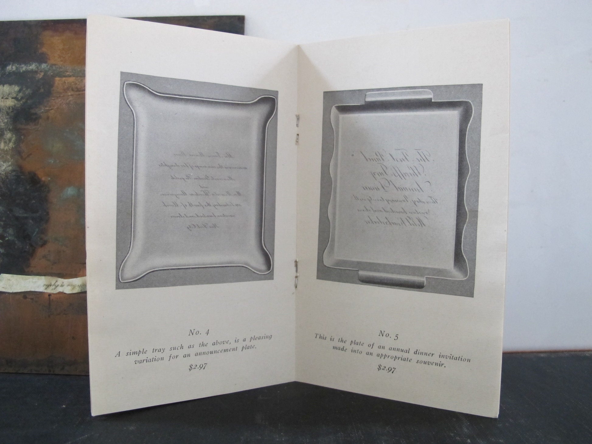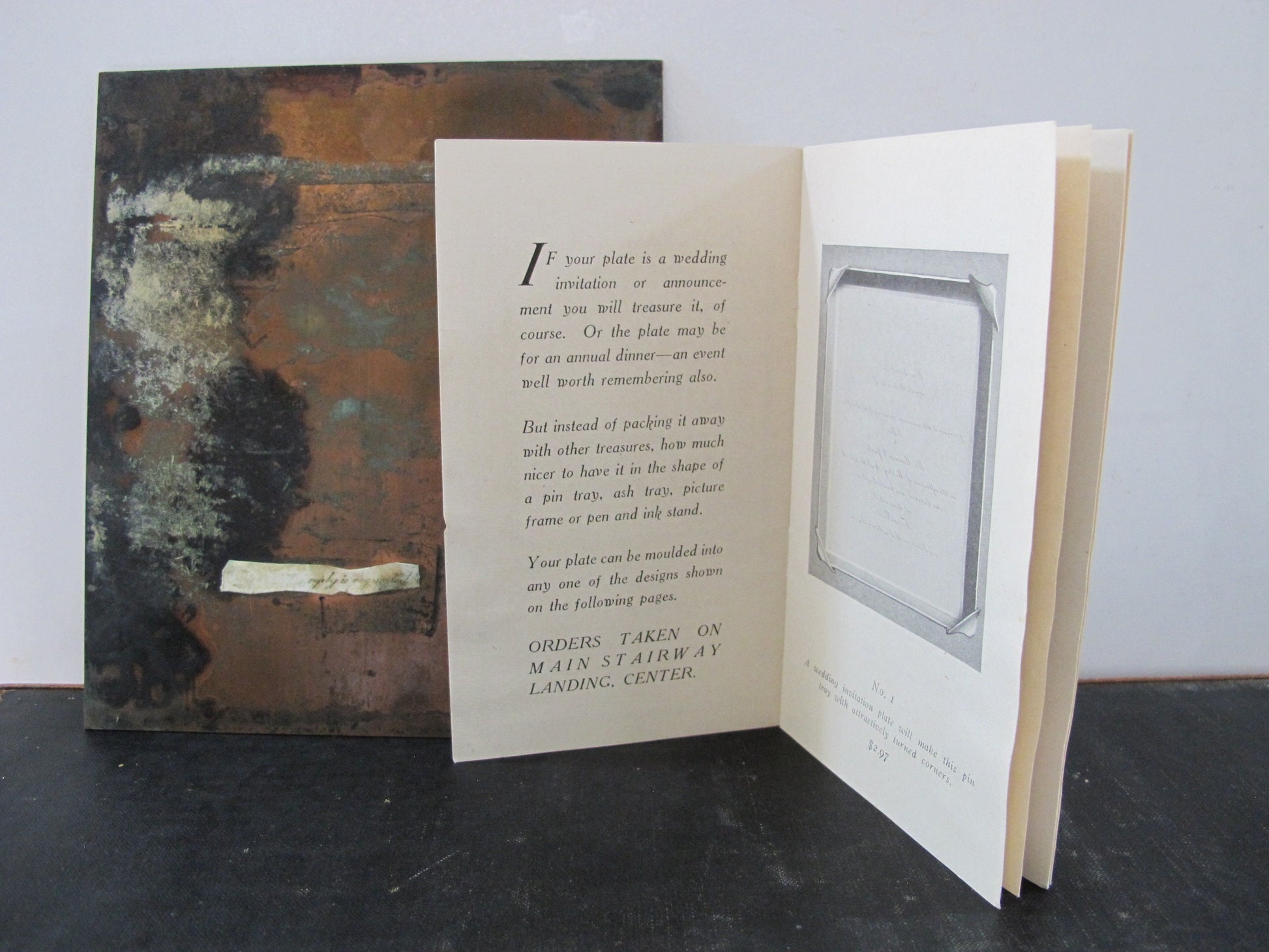 Beautifully patinated printing plate from an engraved wedding invitation of the 1910s/1920s, with associated booklet on how the plate itself could be transformed into a variety of objects.